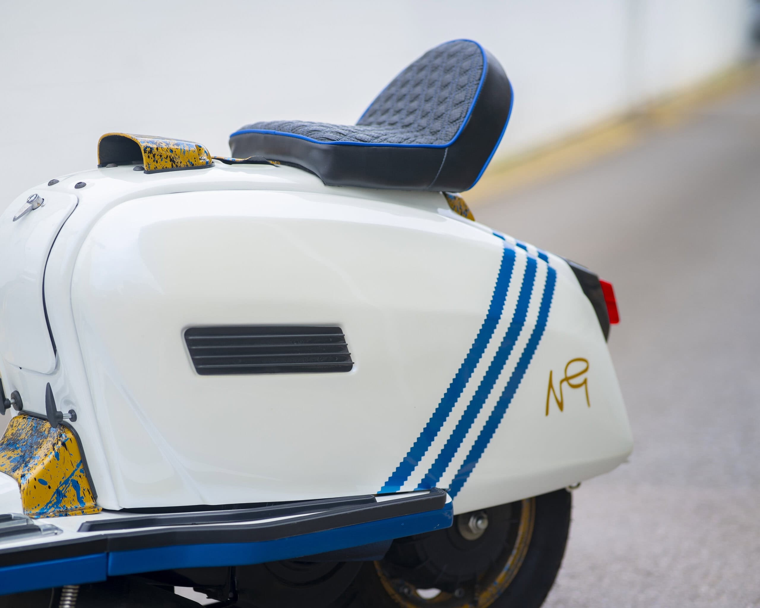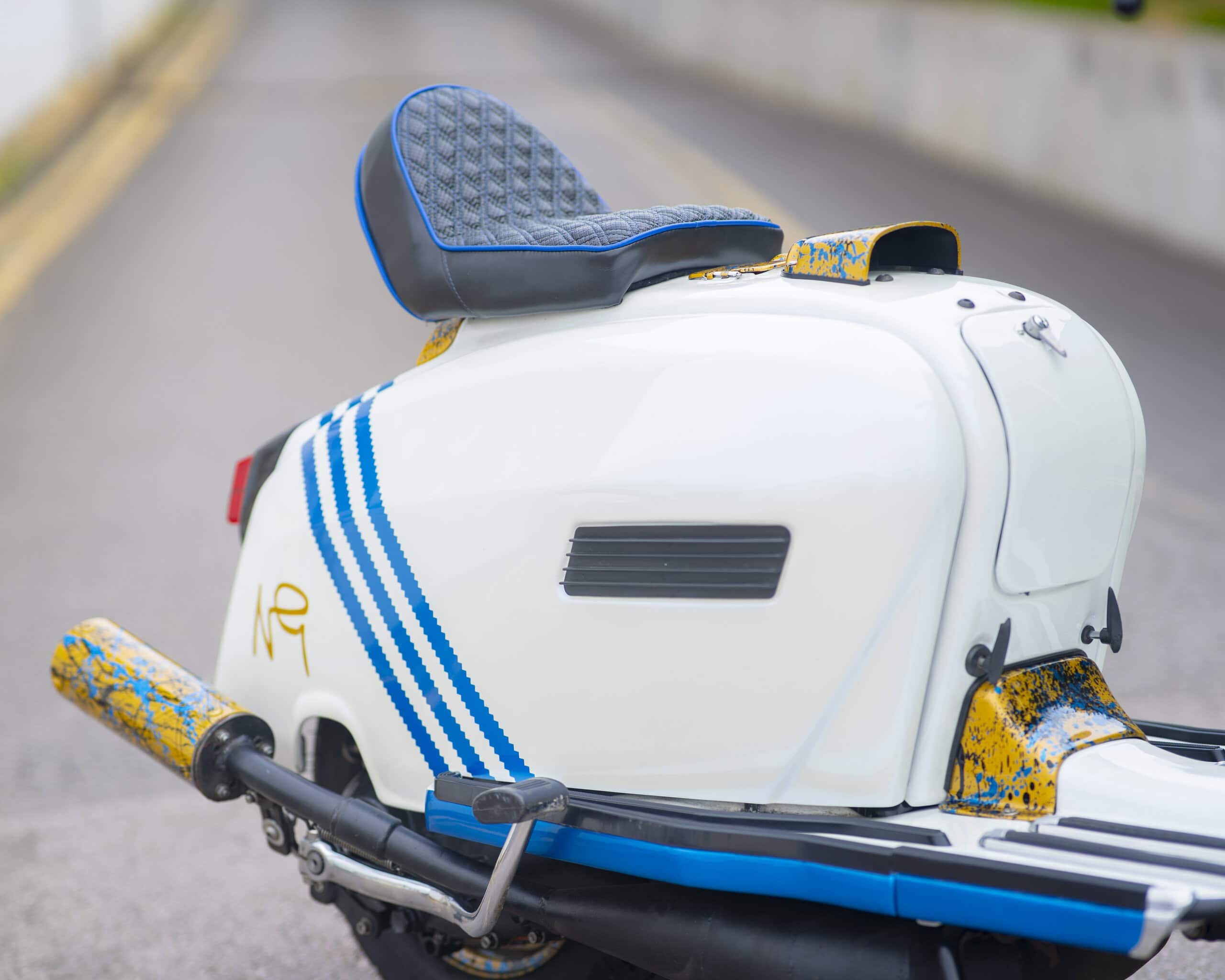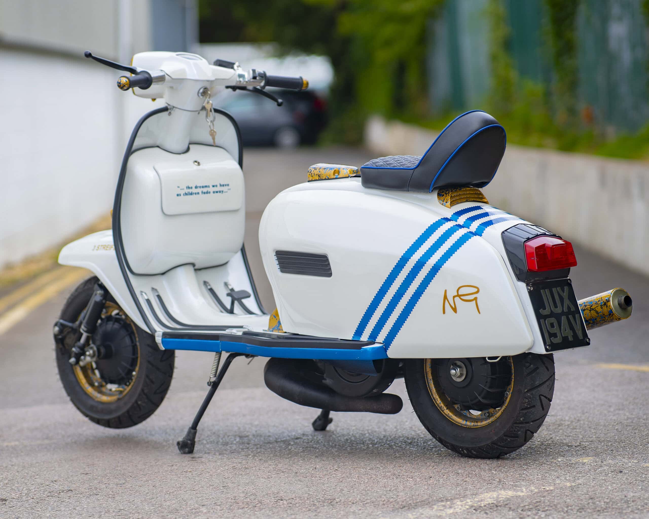 Registered as a 125cc, it’s been fully rebuilt with a TS1 225 kit, offering big power and classic 2-stroke thrills. The build was carried out by two of the most respected names in the game: Brad Brough (author of Time, Trouble & Money) handled the scooter build, while the engine was built by none other than Dale Winney.