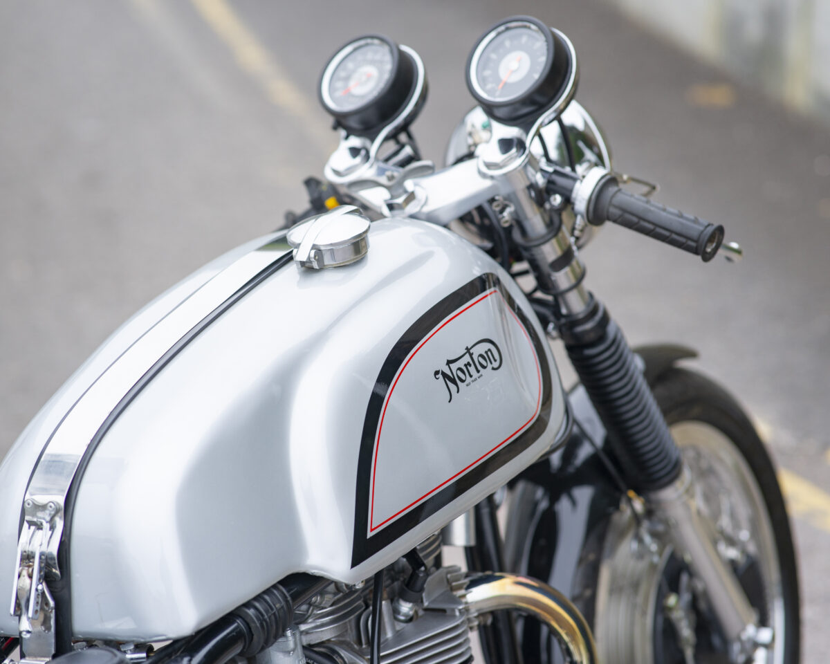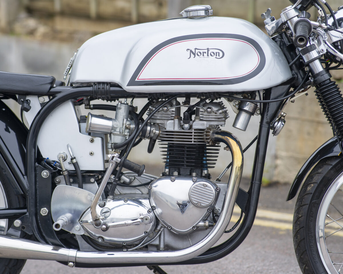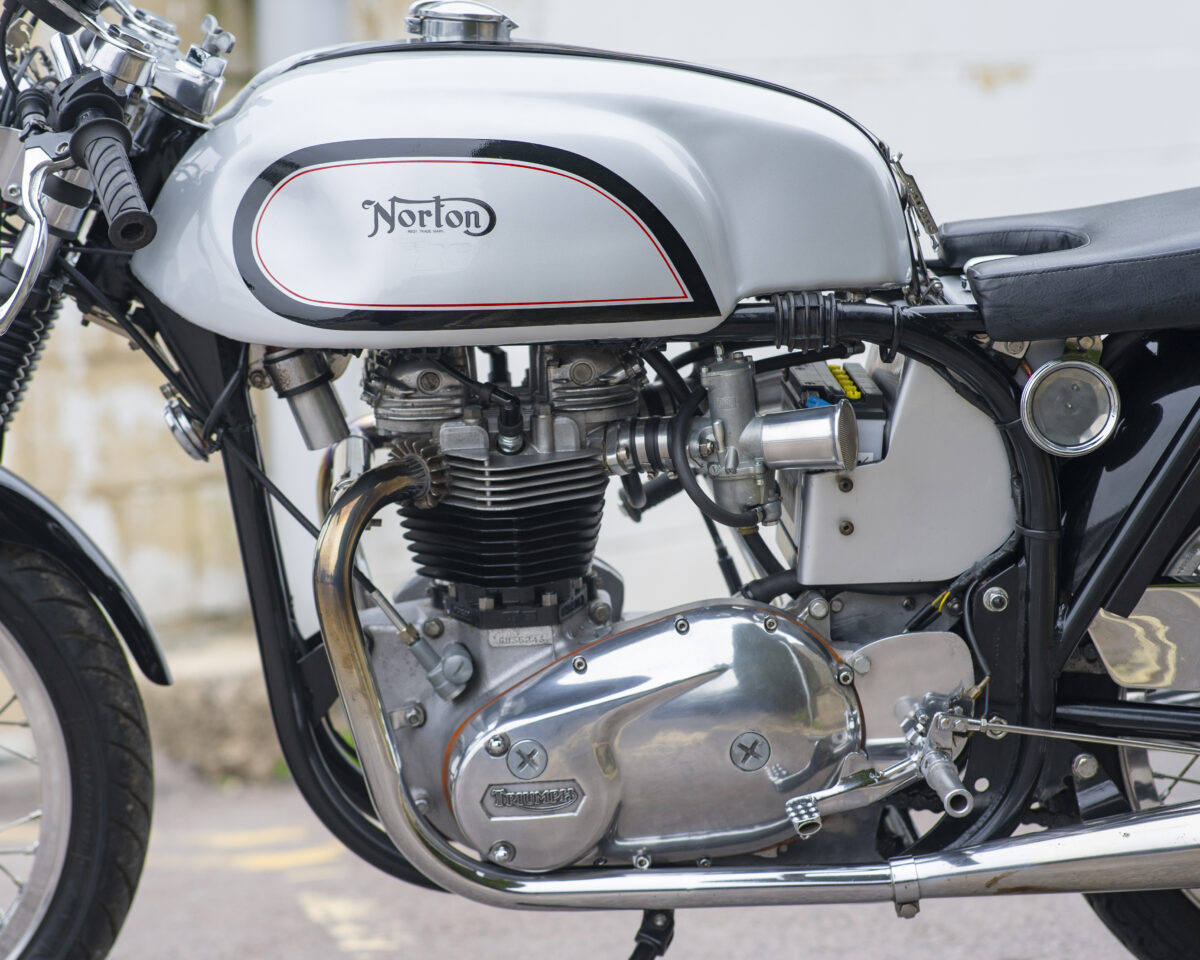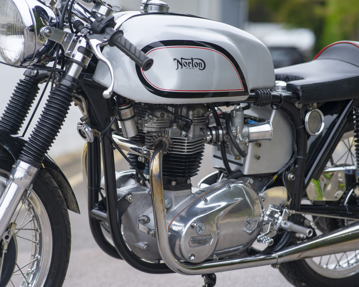 Built around the legendary Norton Wideline Featherbed frame, it’s powered by a Triumph 750cc unit-construction engine (from a TR7RV), topped with a twin-carb head and finished with a full café racer spec.