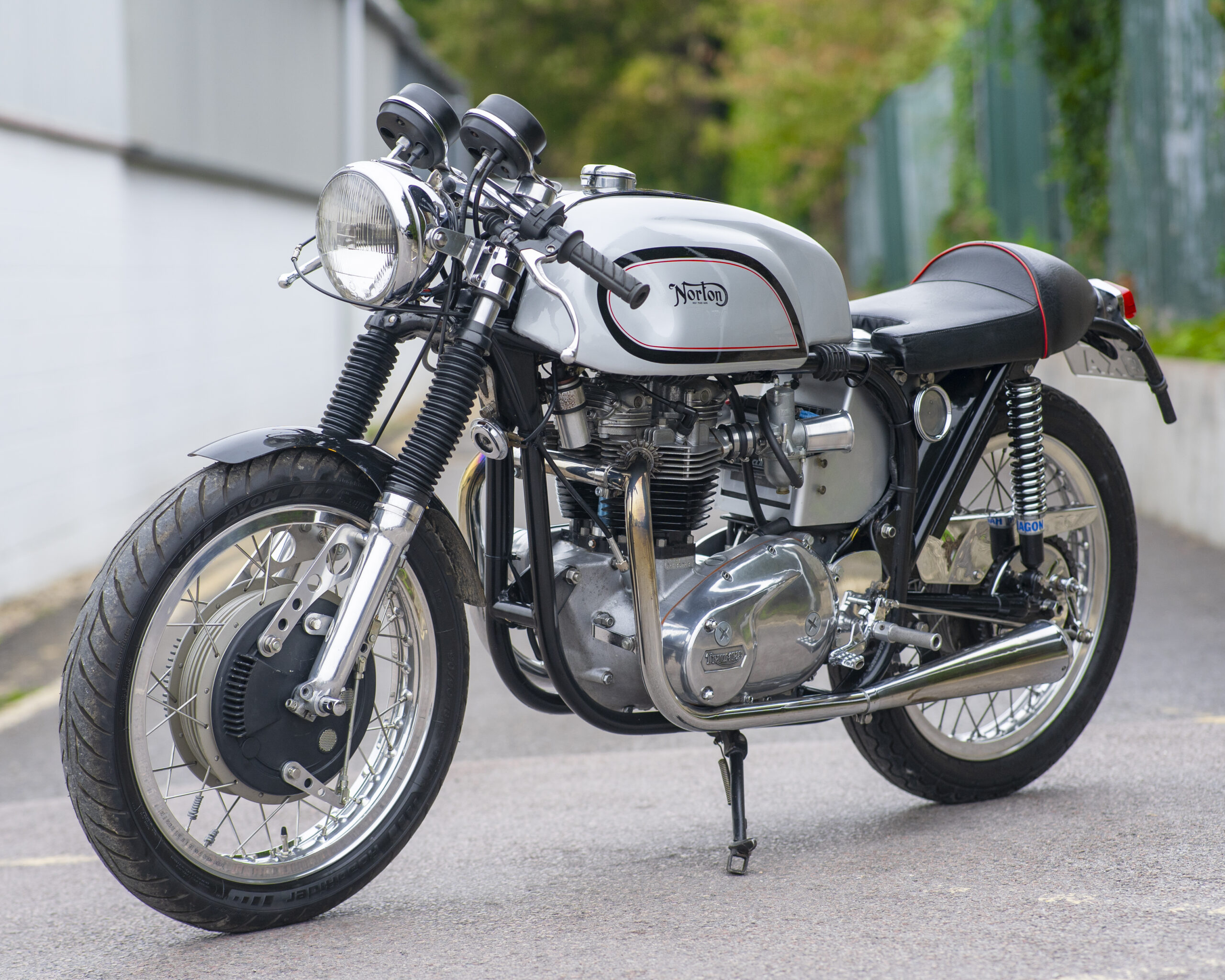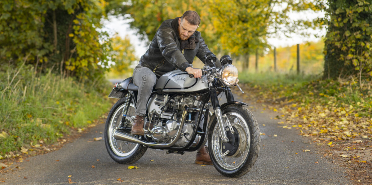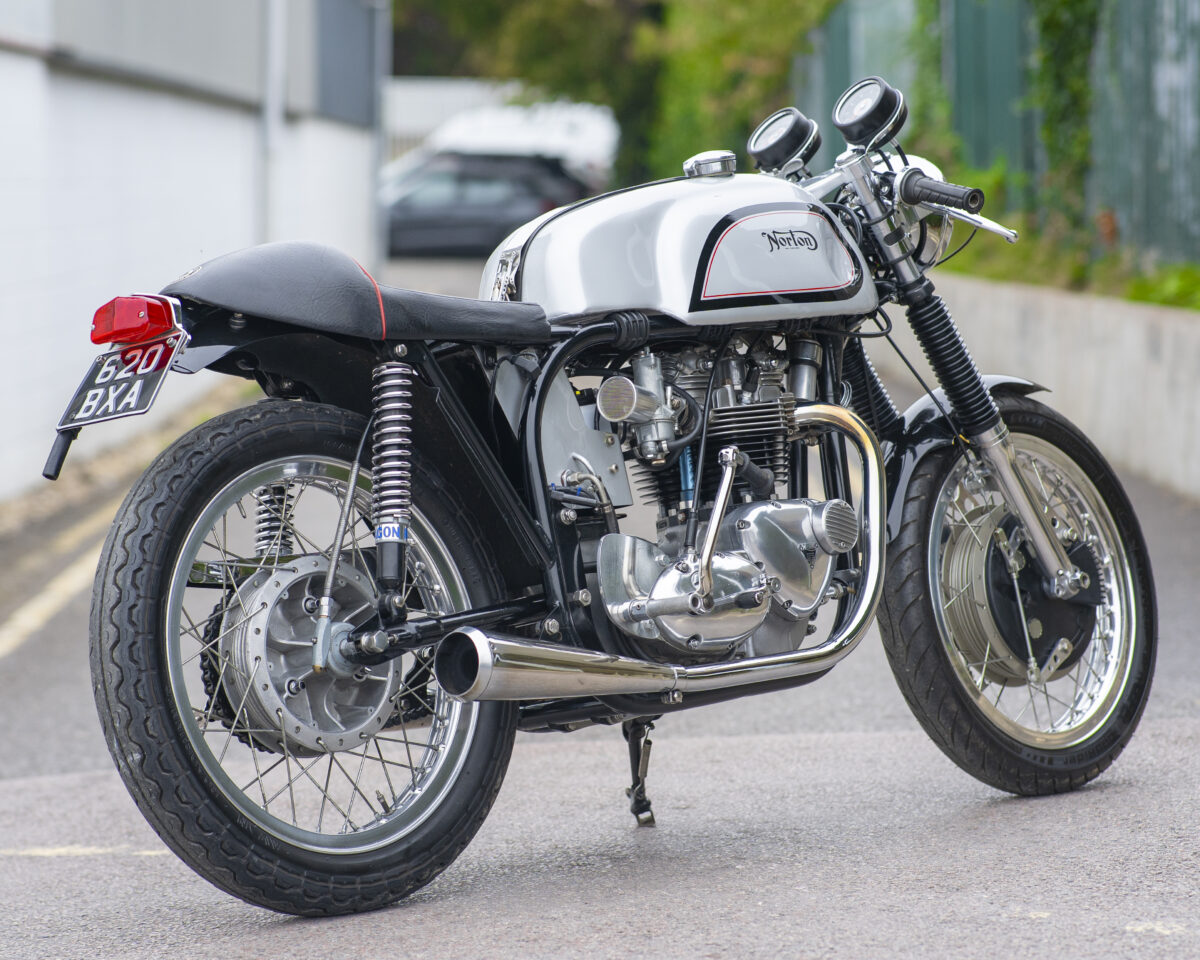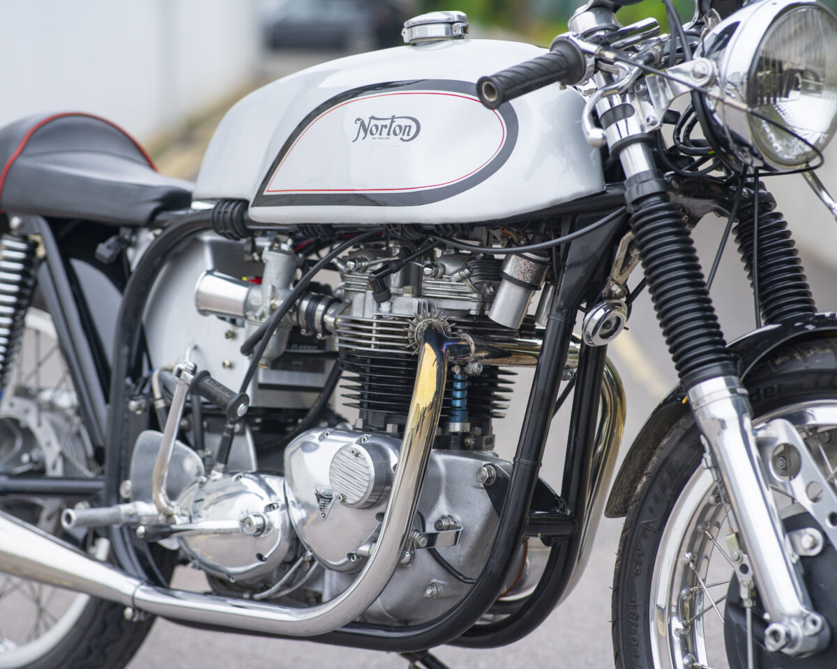 Built around the legendary Norton Wideline Featherbed frame, it’s powered by a Triumph 750cc unit-construction engine (from a TR7RV), topped with a twin-carb head and finished with a full café racer spec.