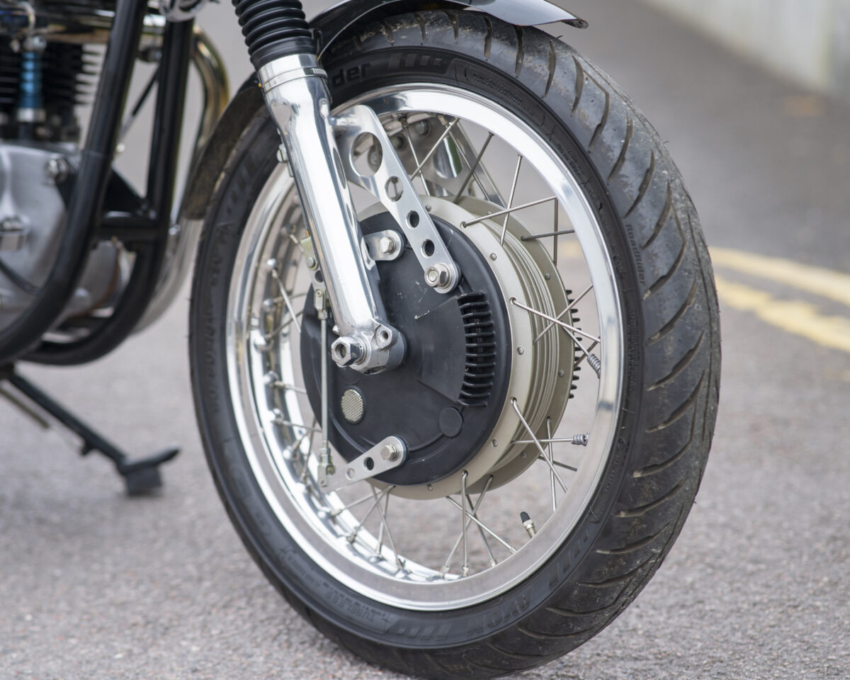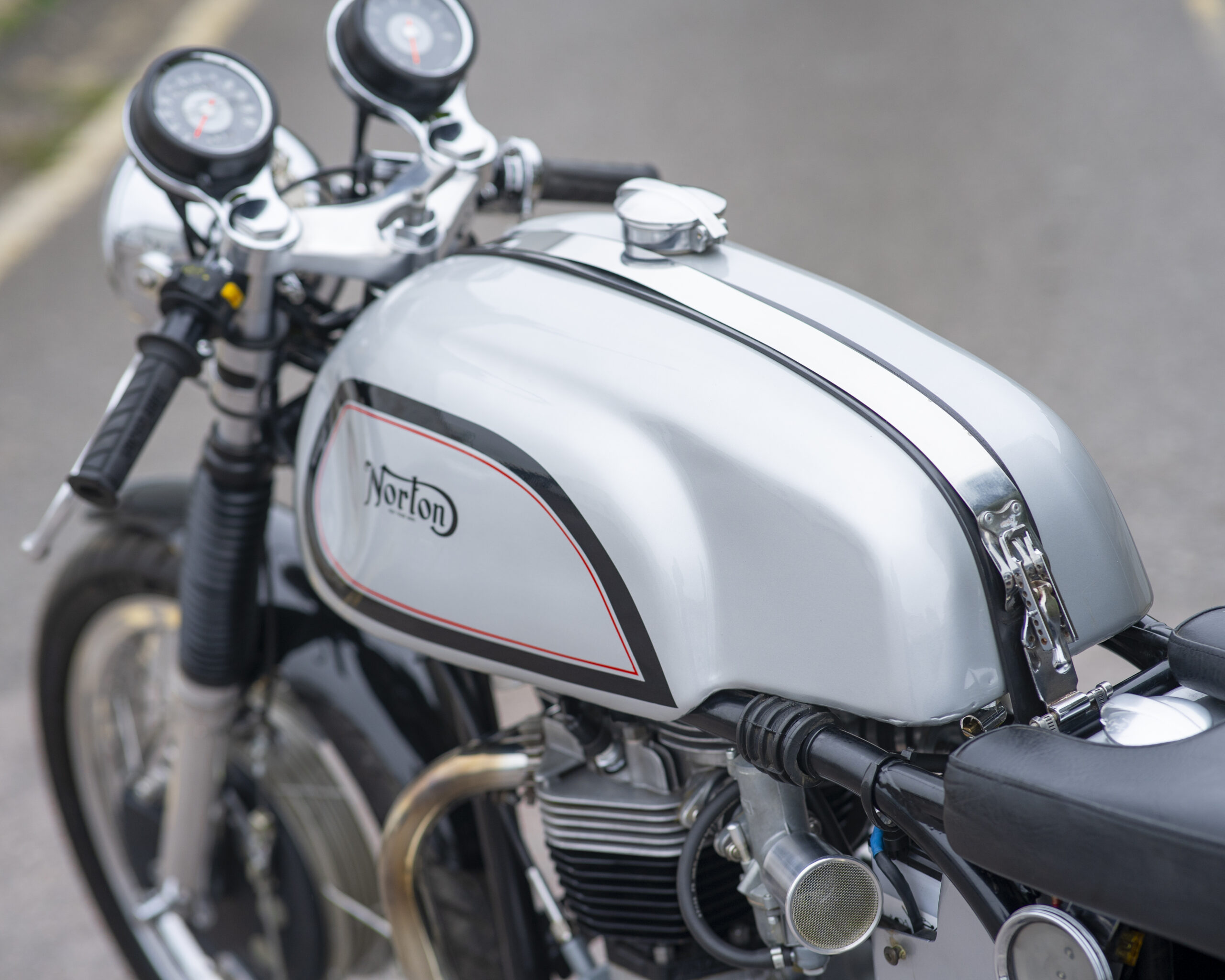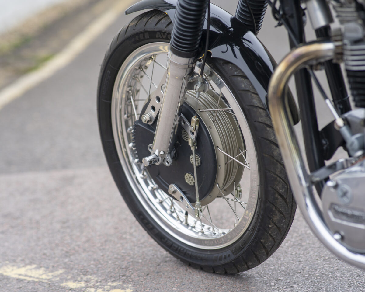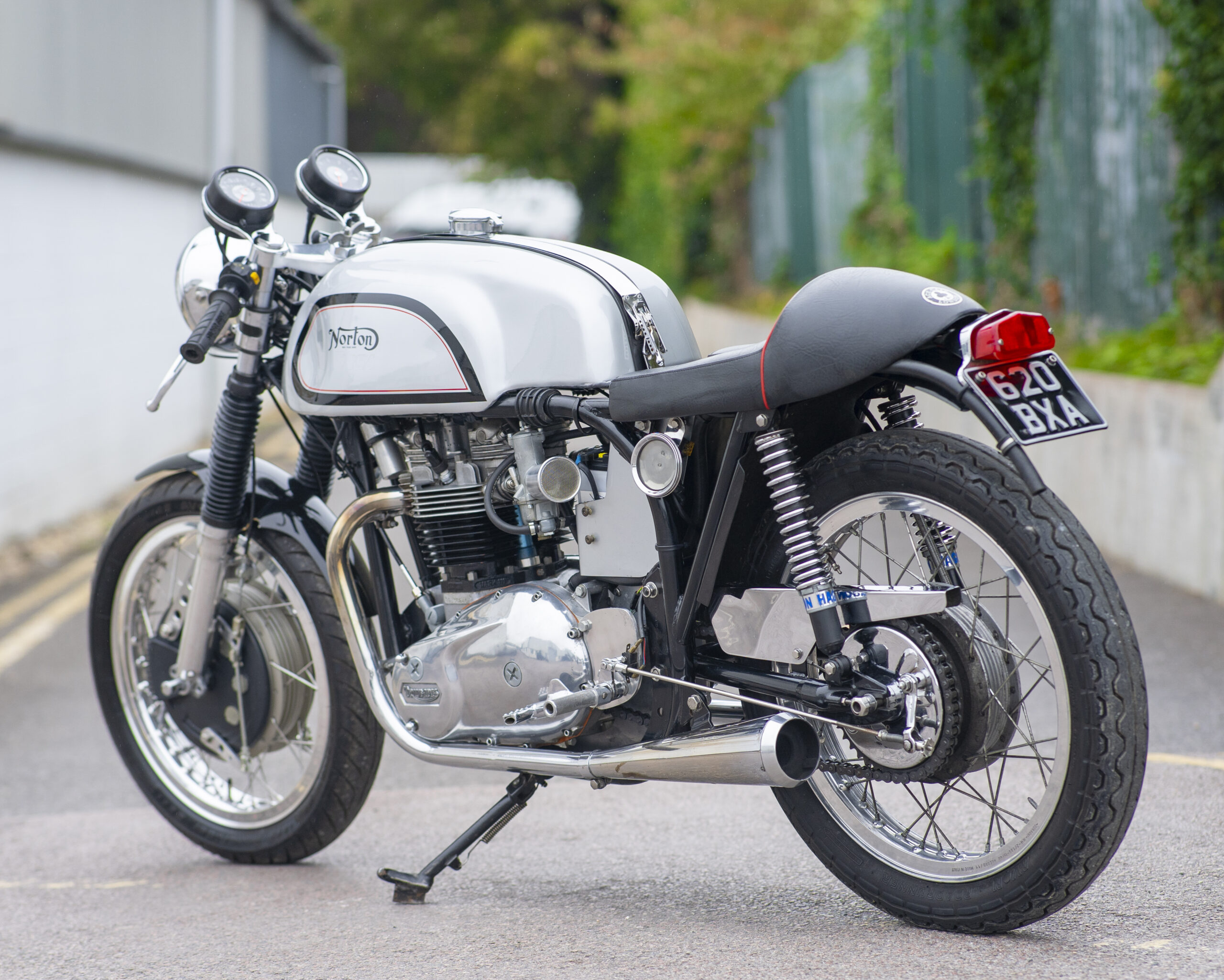 Built around the legendary Norton Wideline Featherbed frame, it’s powered by a Triumph 750cc unit-construction engine (from a TR7RV), topped with a twin-carb head and finished with a full café racer spec.