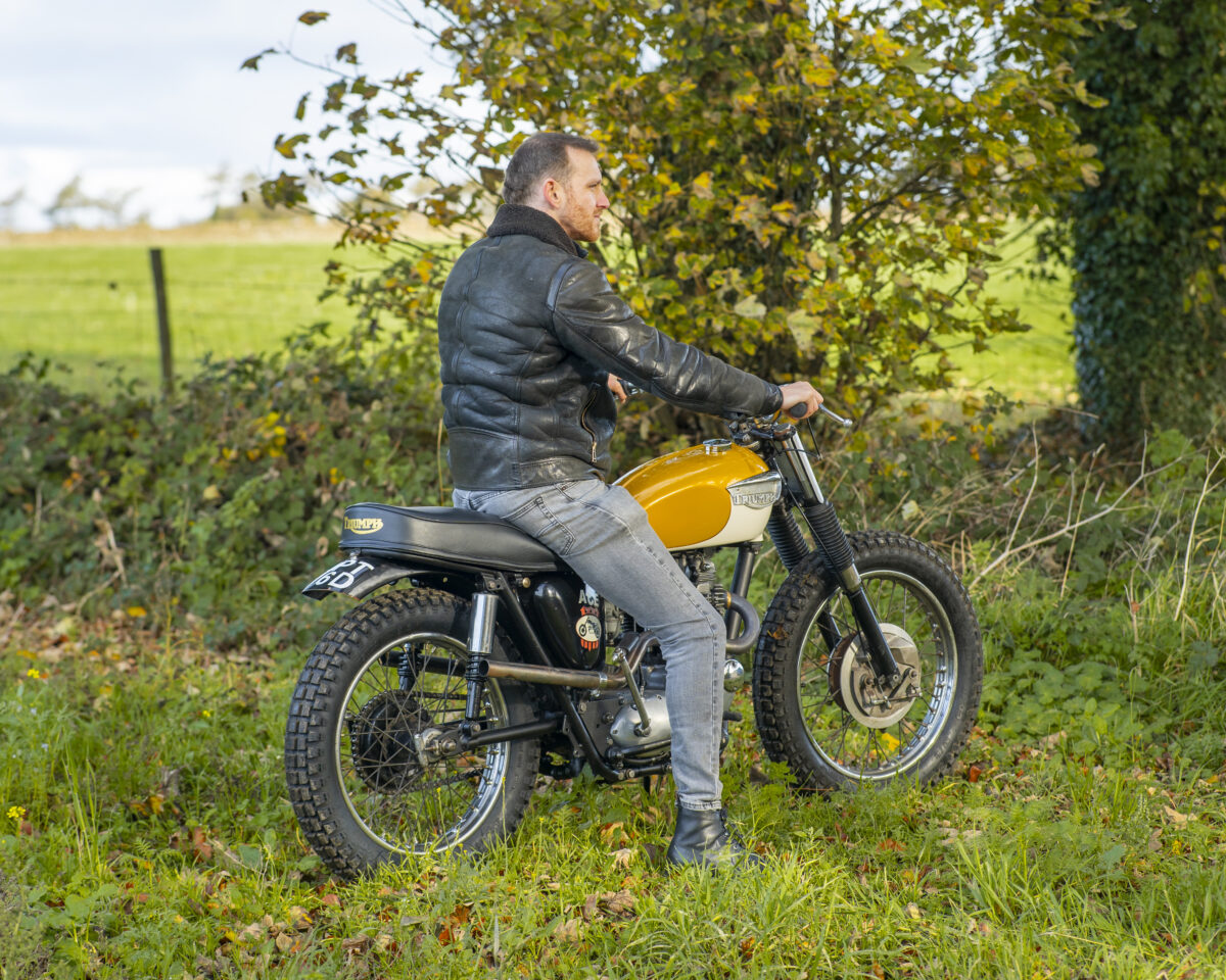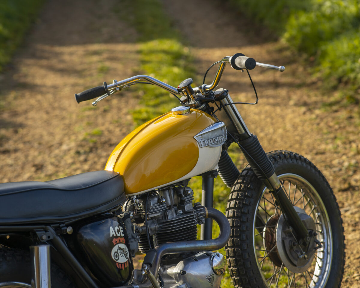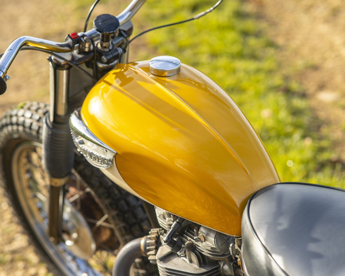 Finished with a US-spec sunburst yellow fuel tank, high-level pipes, period correct off-road tyres, and shortened rear mudguard, it looks the part and rides just as well. A stainless number board, tidy details, and a strong-running 650cc parallel twin give it real road presence.