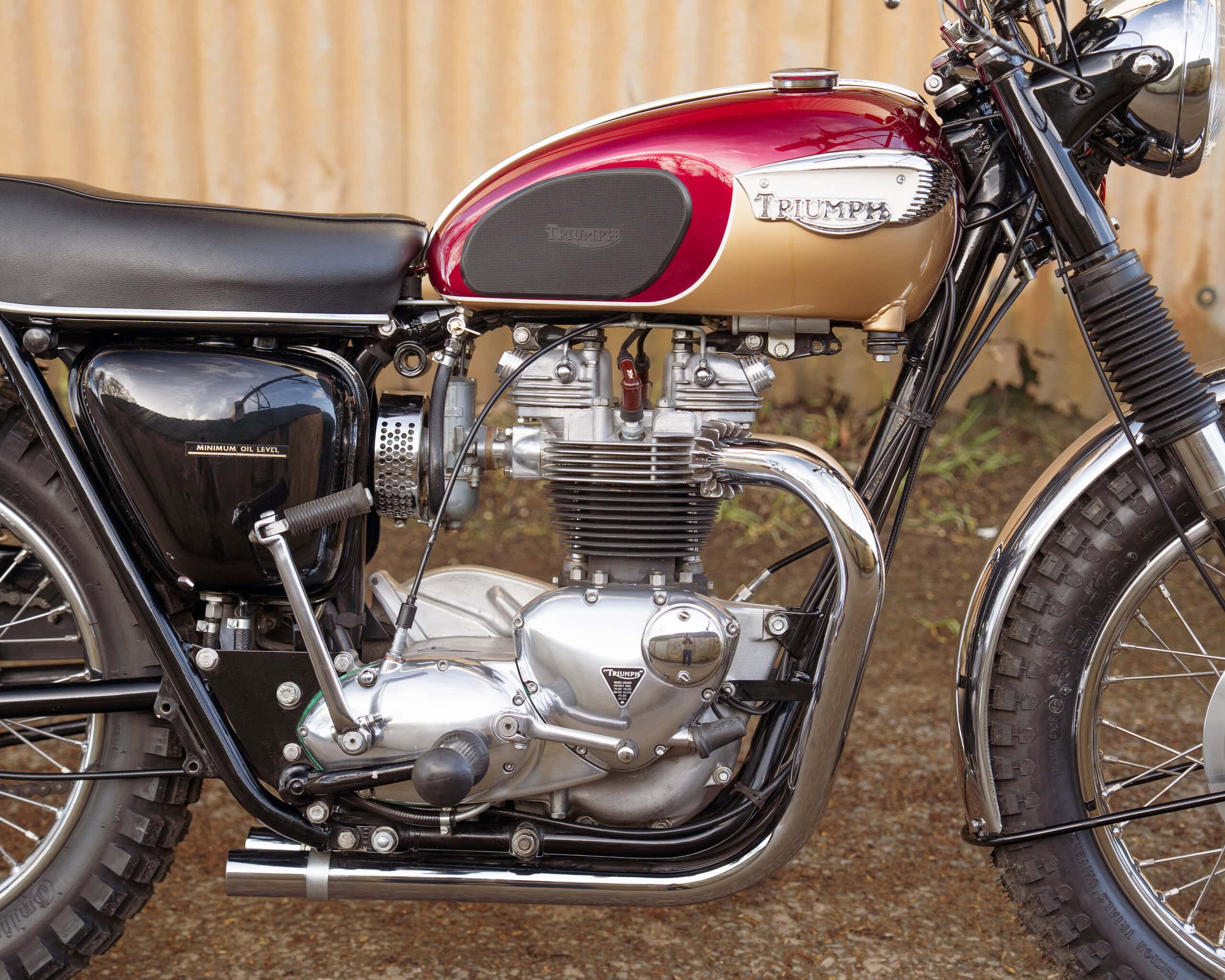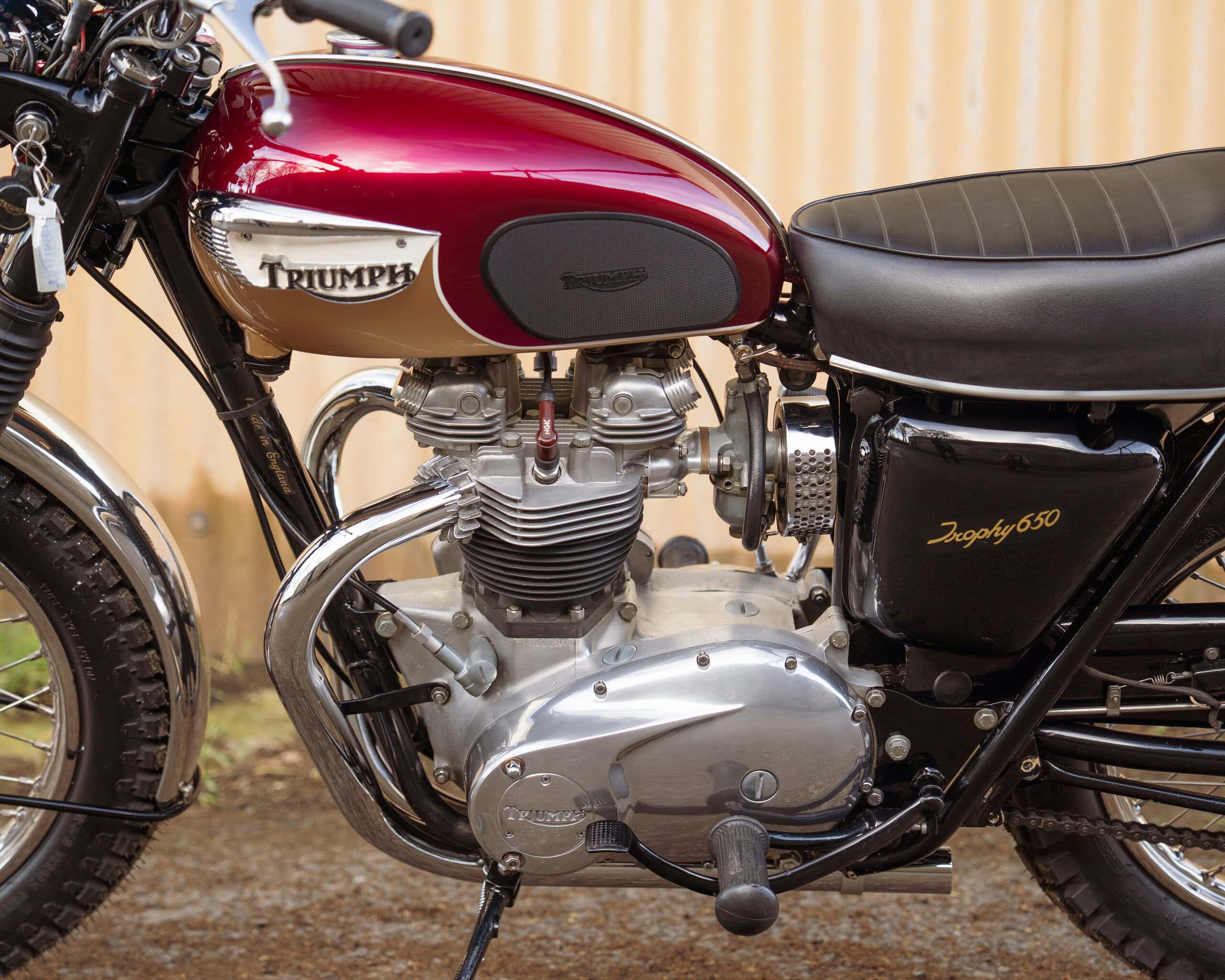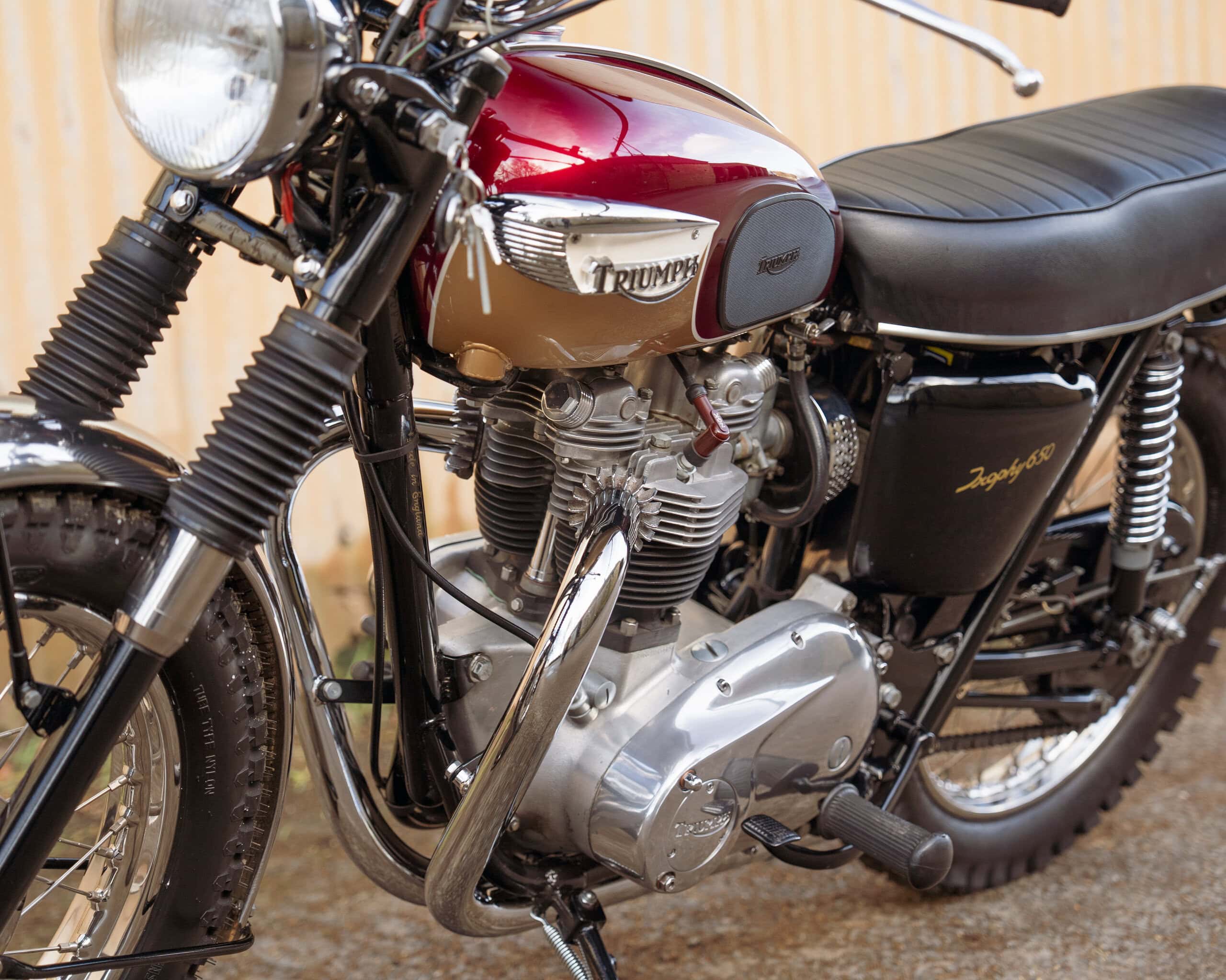 Finished in the iconic Aubergine and Gold colour scheme – famously used on the final production year of the TT Bonneville – this bike perfectly captures the look and spirit of Triumph’s late-1960s competition models. It is fitted with a correct-style TT exhaust system, giving it that unmistakable deep, aggressive tone.