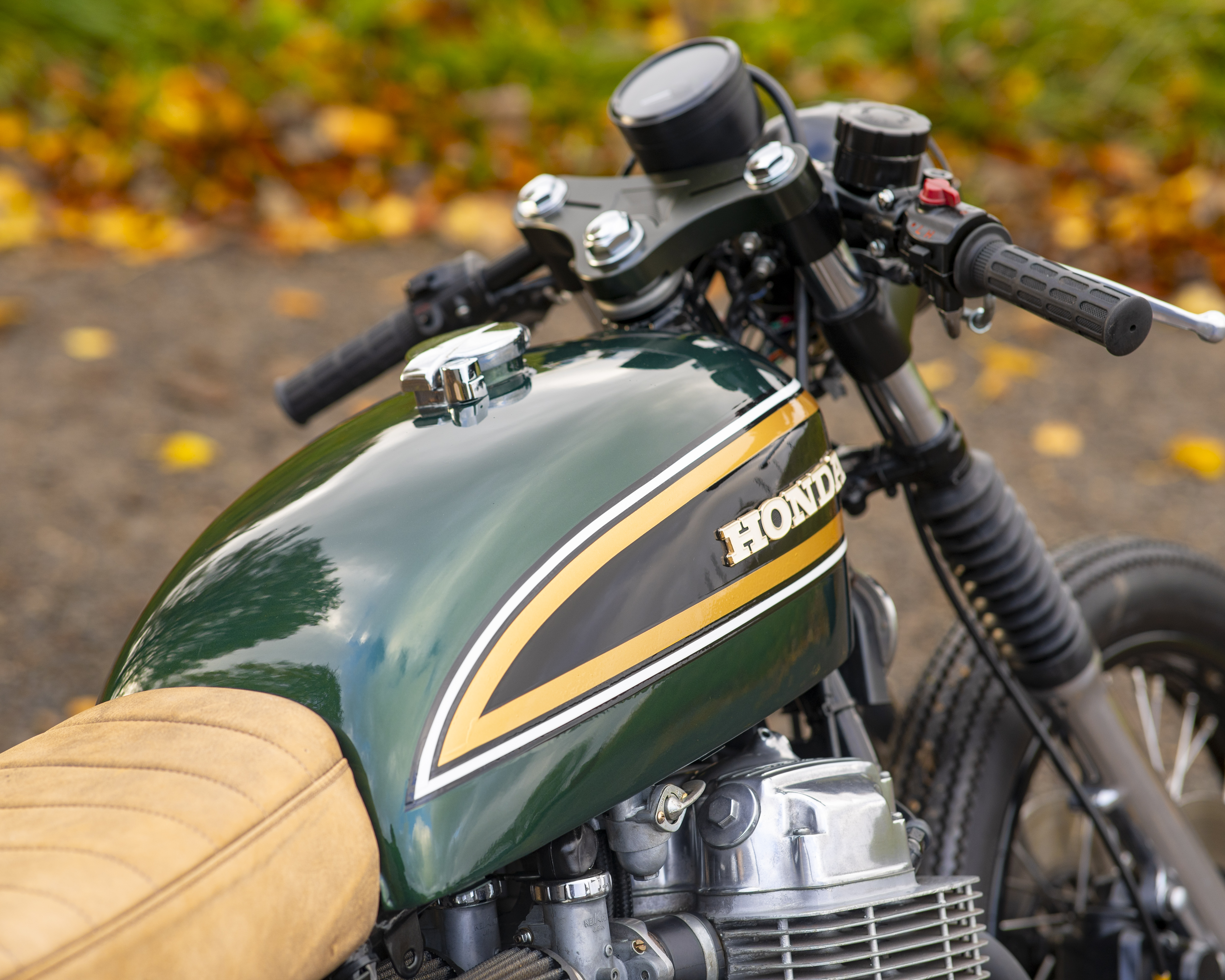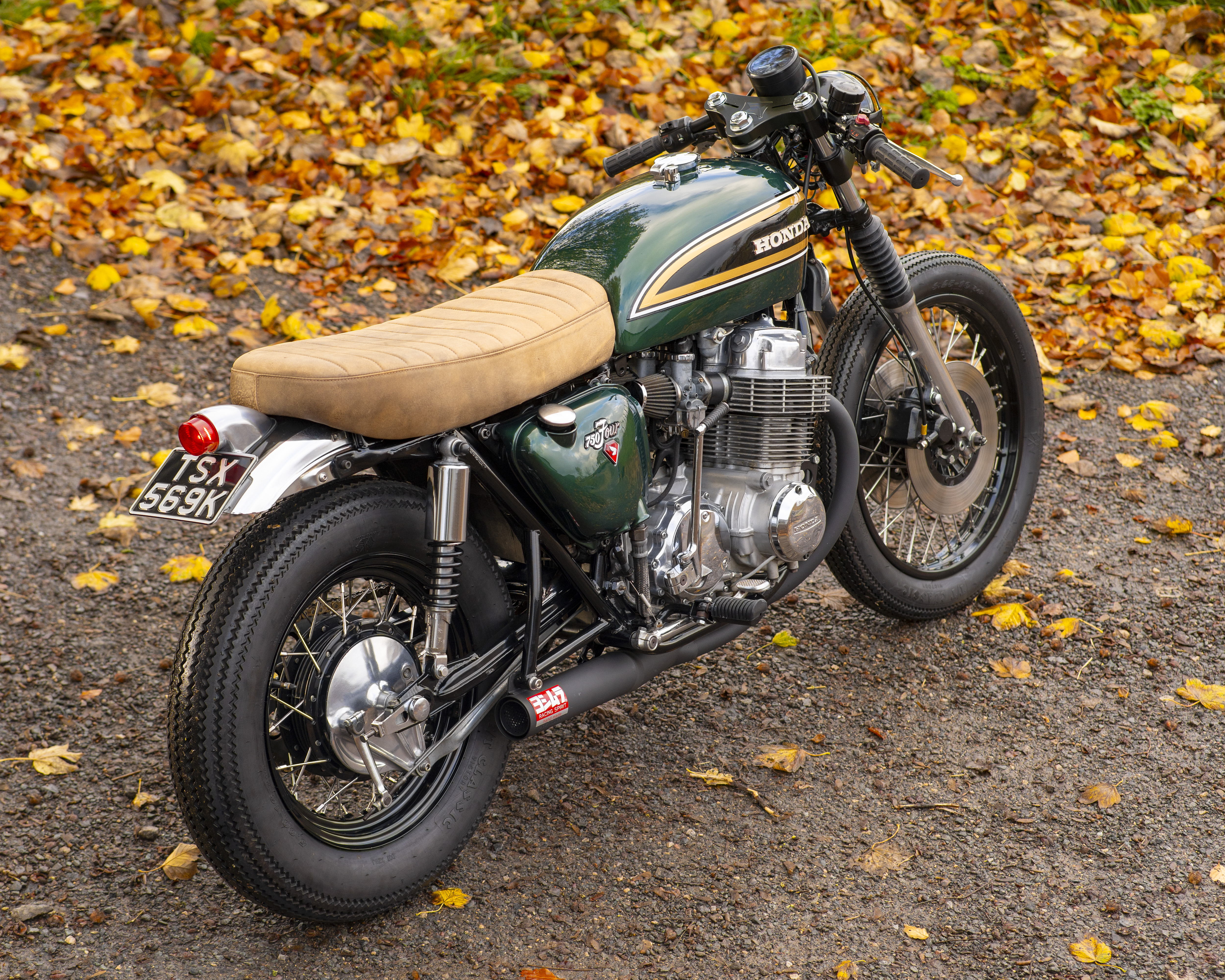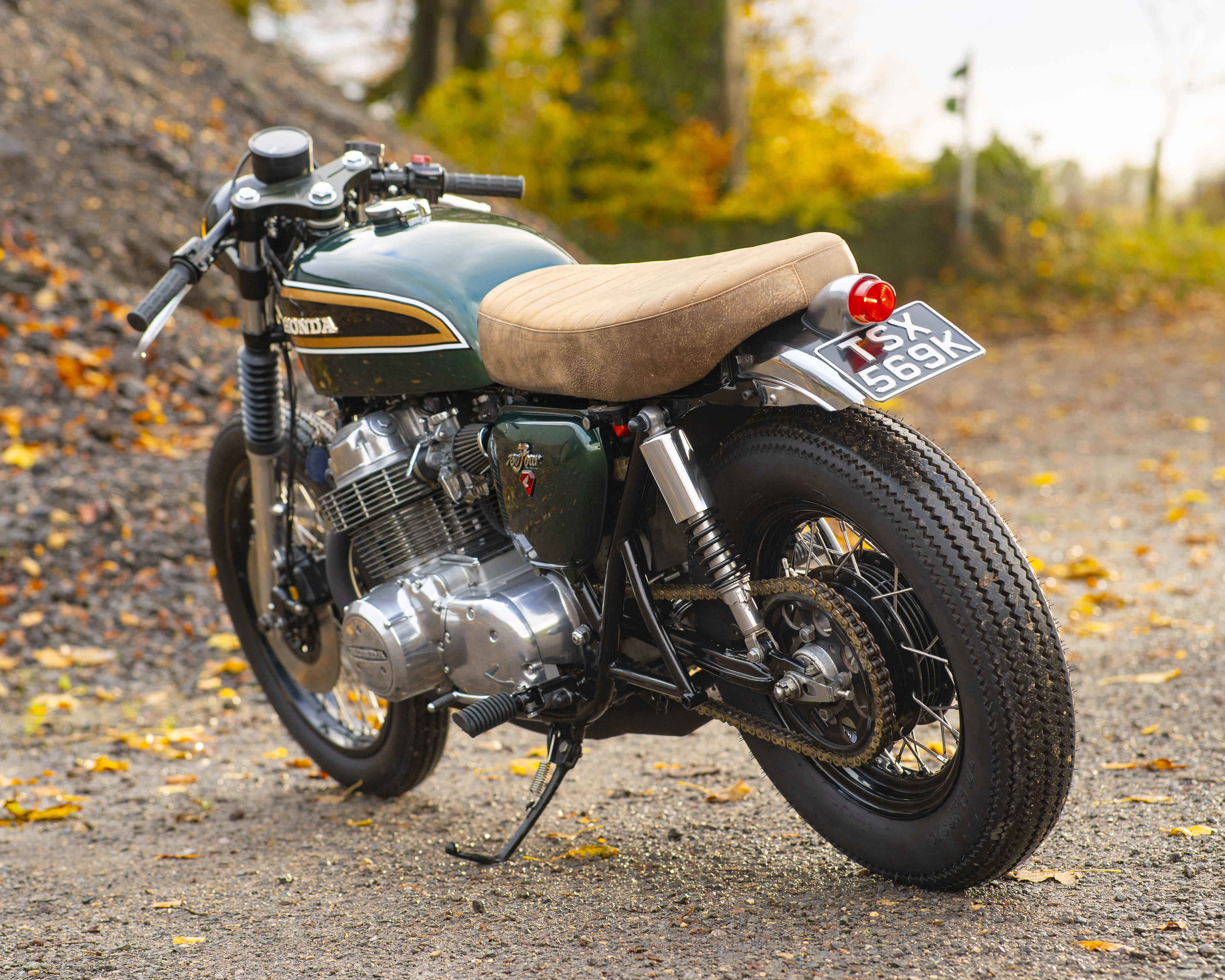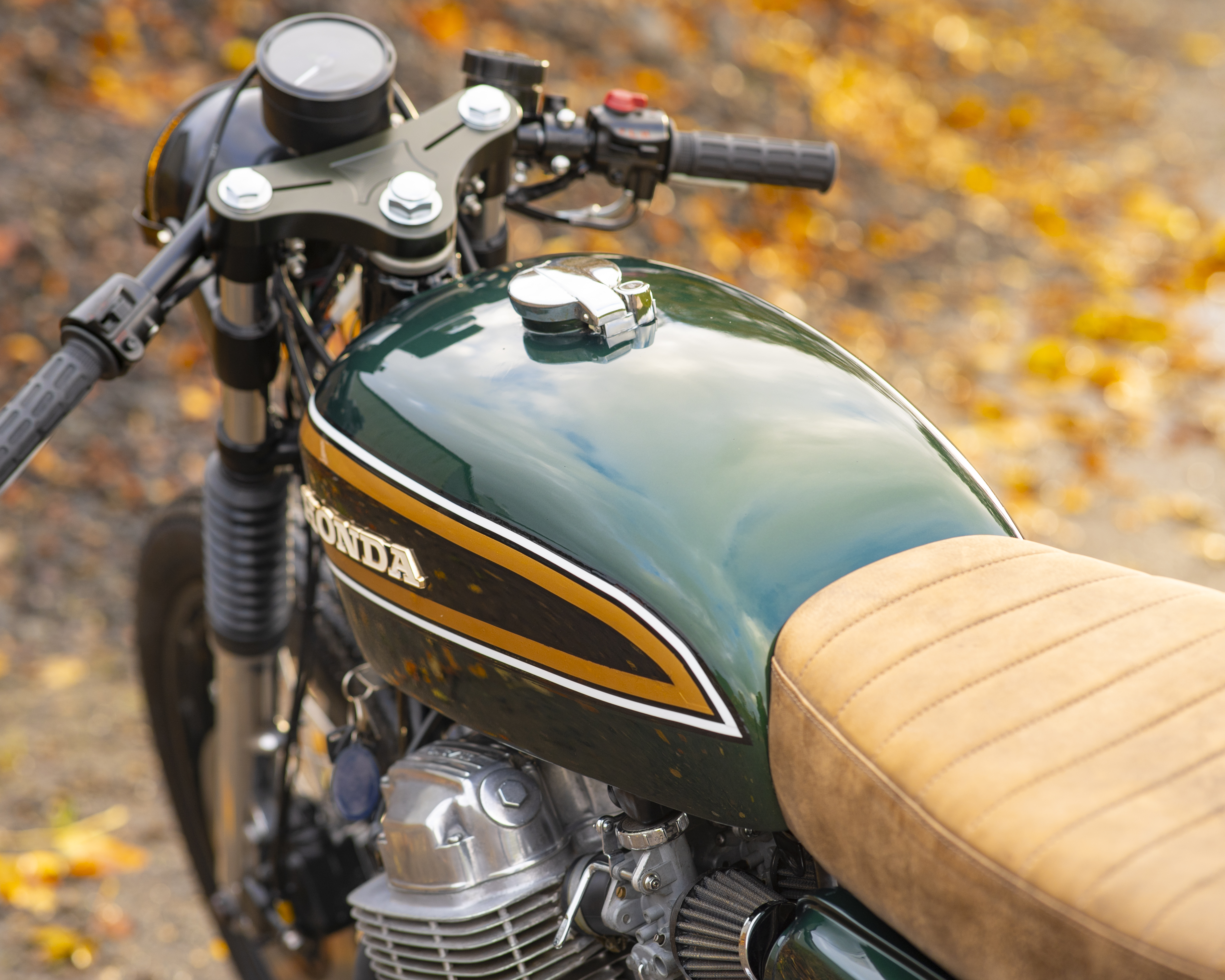 Finished in a custom deep green with black, gold and white tank accents, and topped off with a tan leather-trimmed seat pad, this build perfectly captures the spirit of 1970s racing while offering modern usability and classic style.