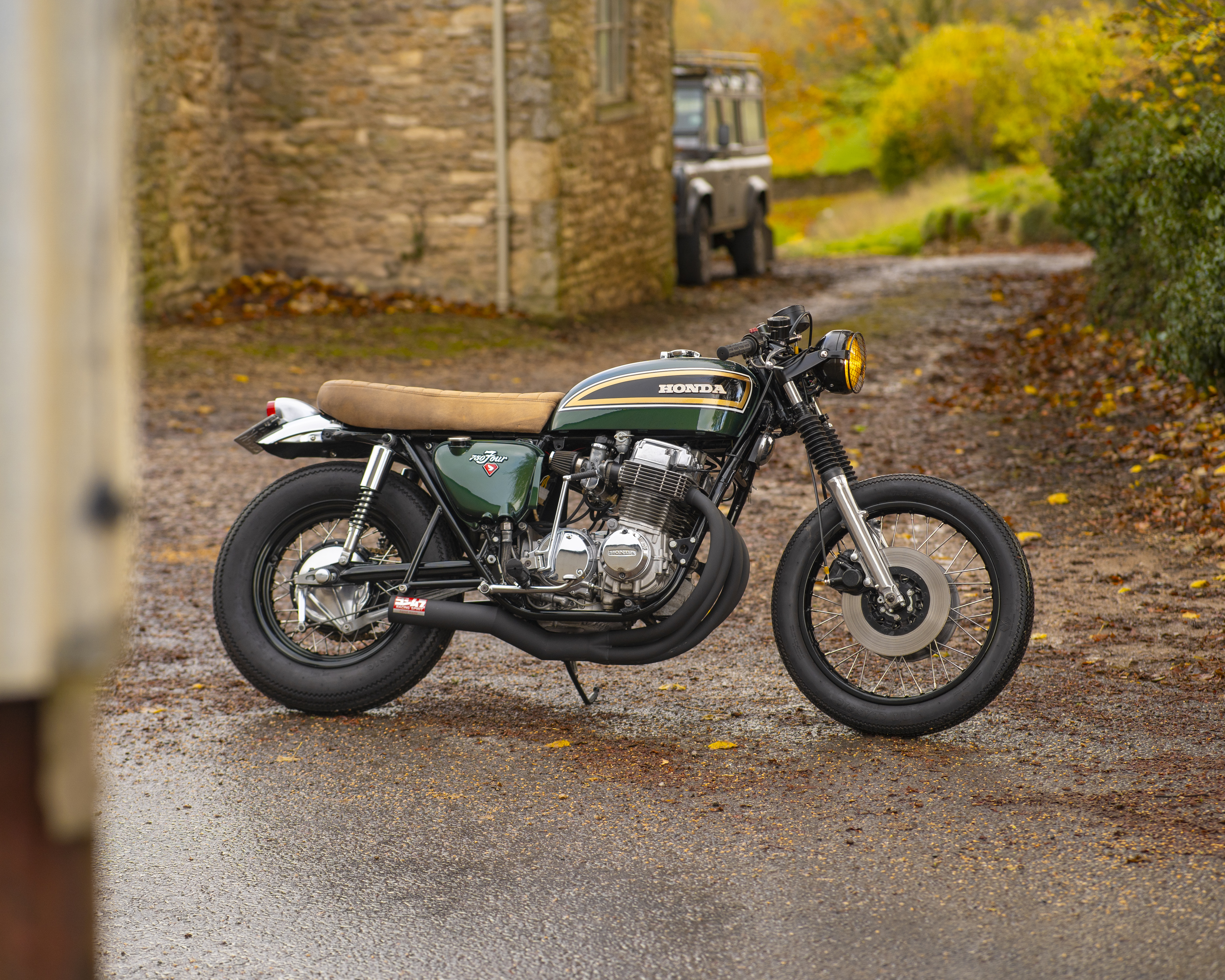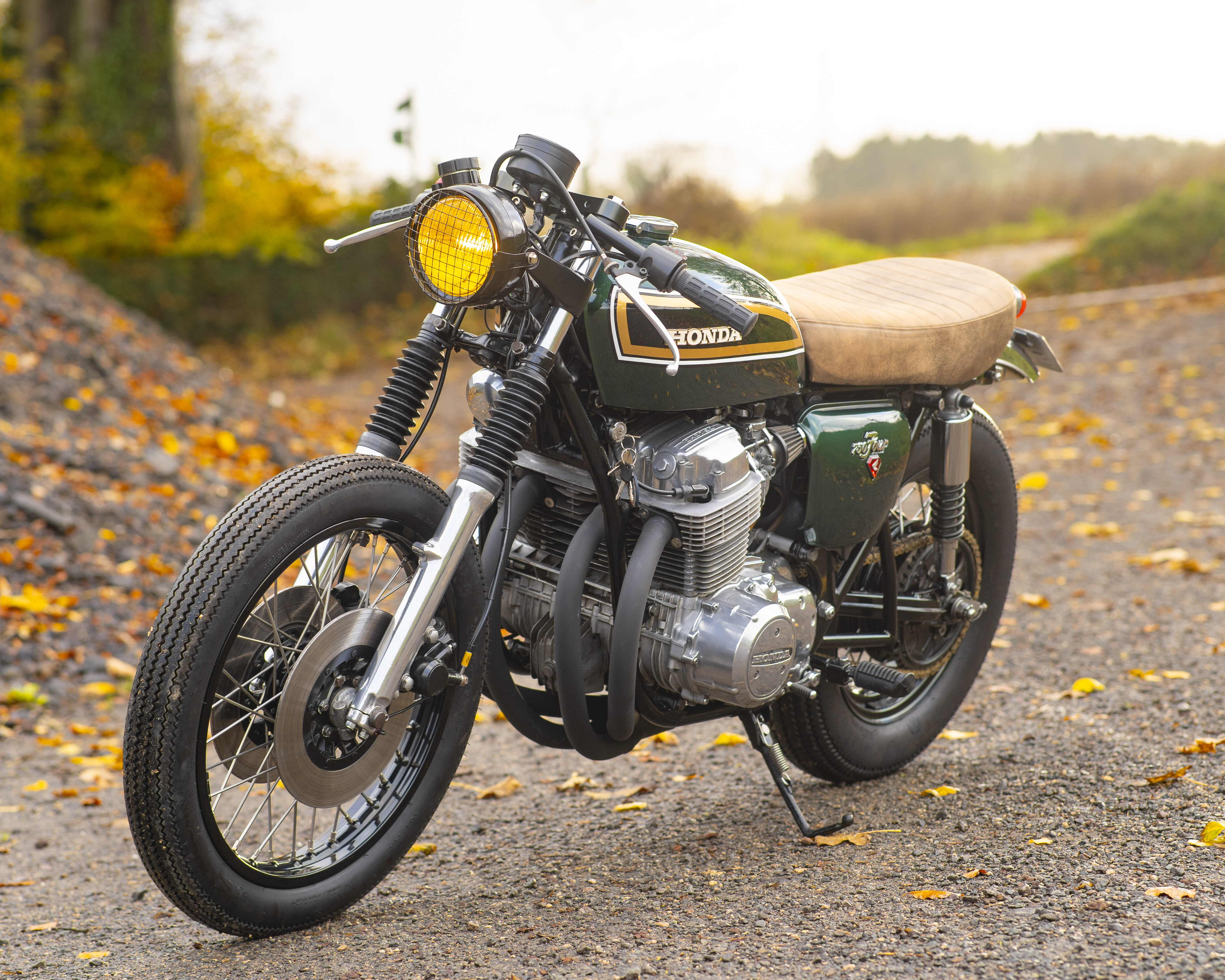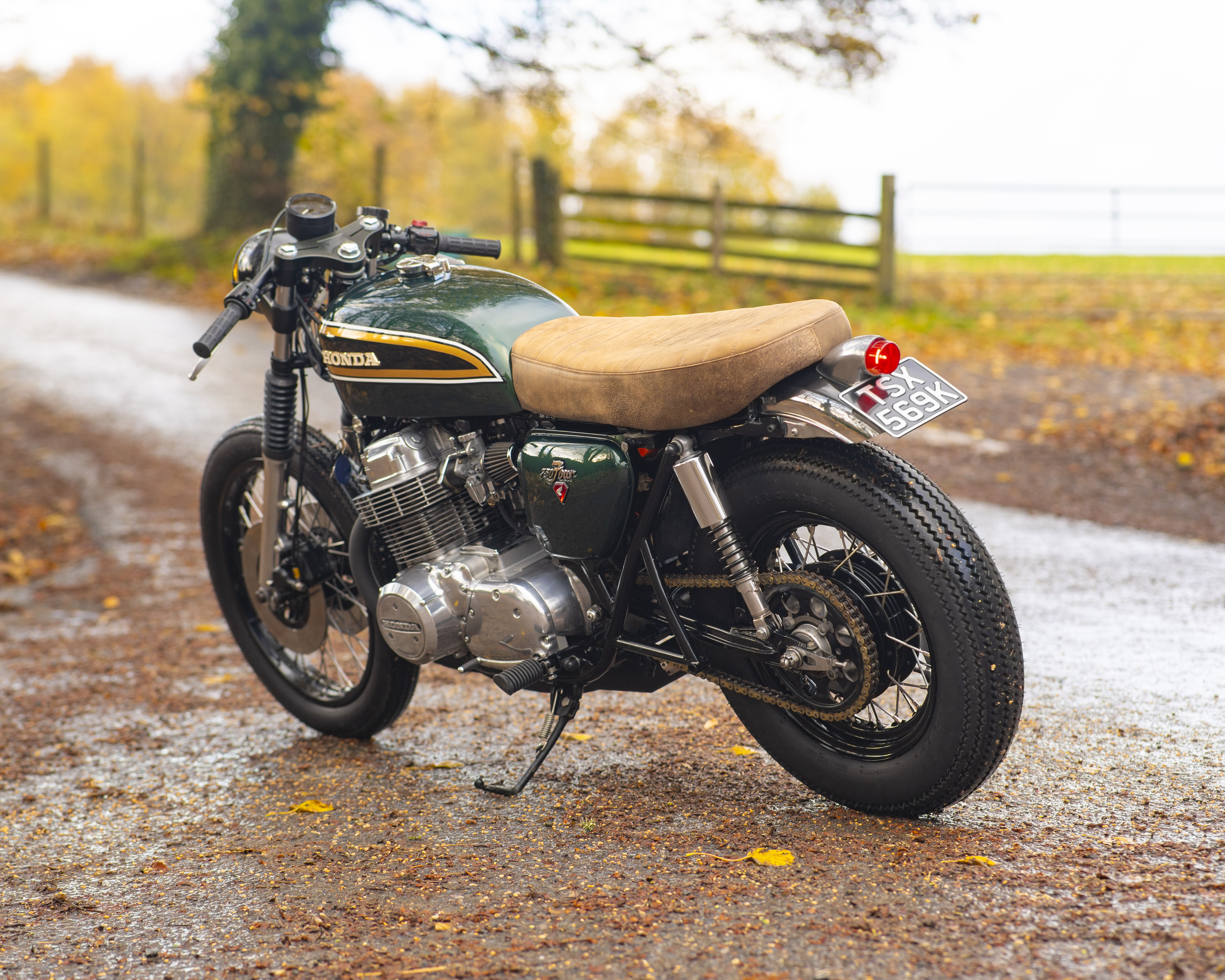 Finished in a custom deep green with black, gold and white tank accents, and topped off with a tan leather-trimmed seat pad, this build perfectly captures the spirit of 1970s racing while offering modern usability and classic style.