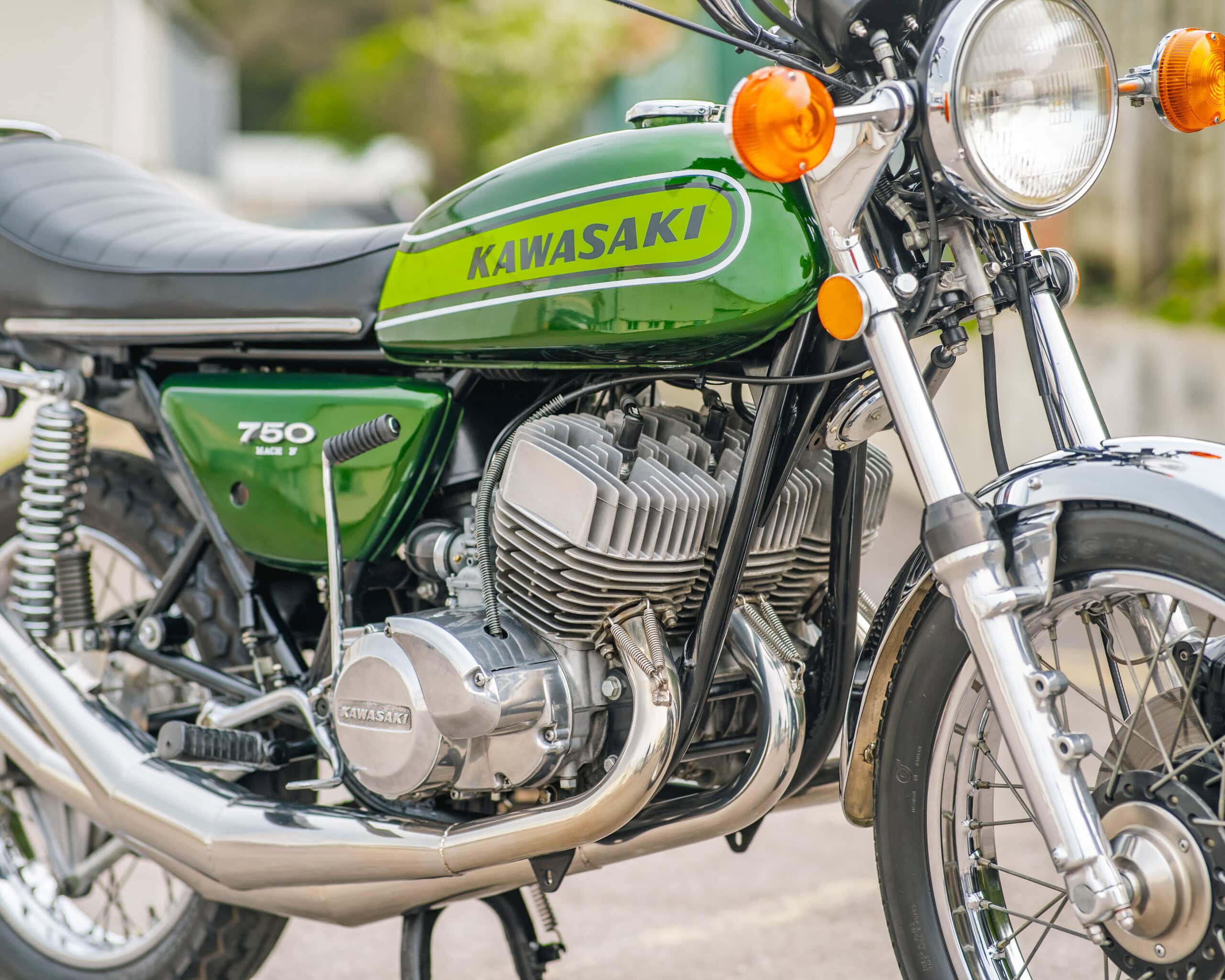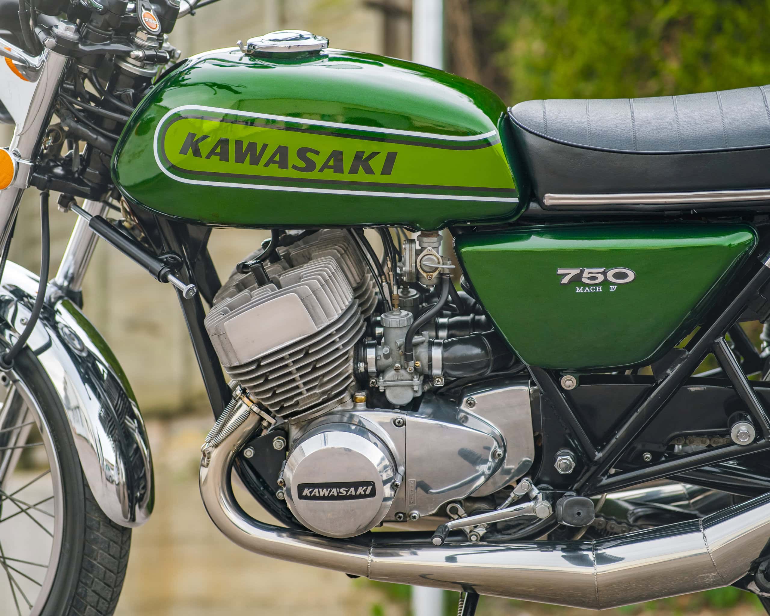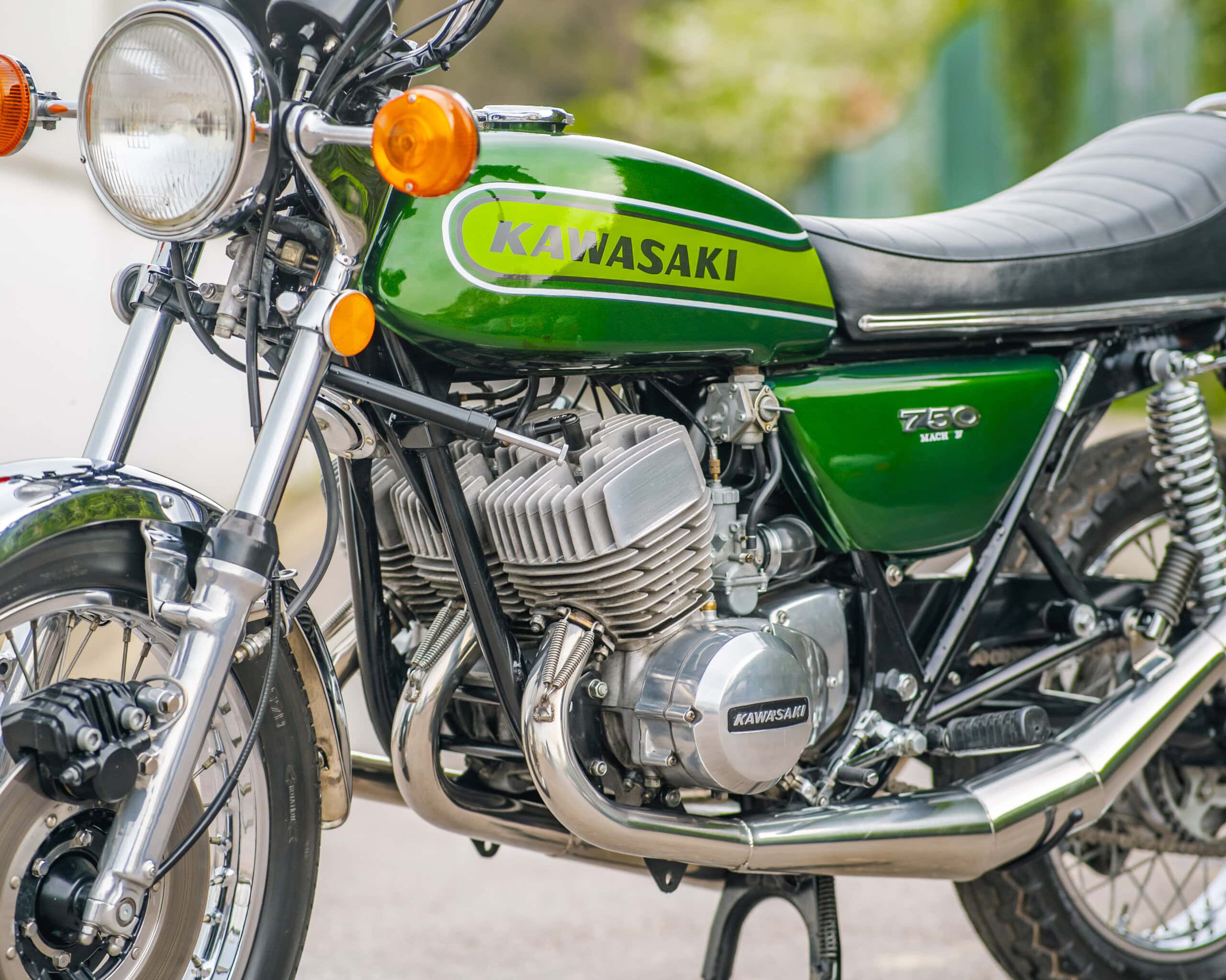 Engine: 748cc, air-cooled, inline three-cylinder, 2-stroke engine – known for its explosive power and raw riding experience.