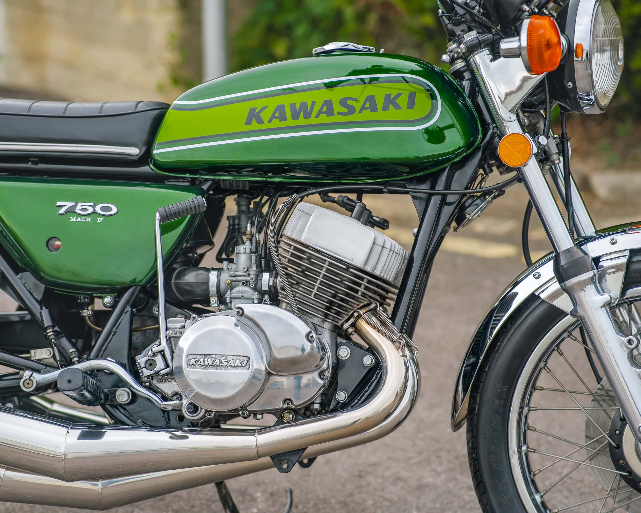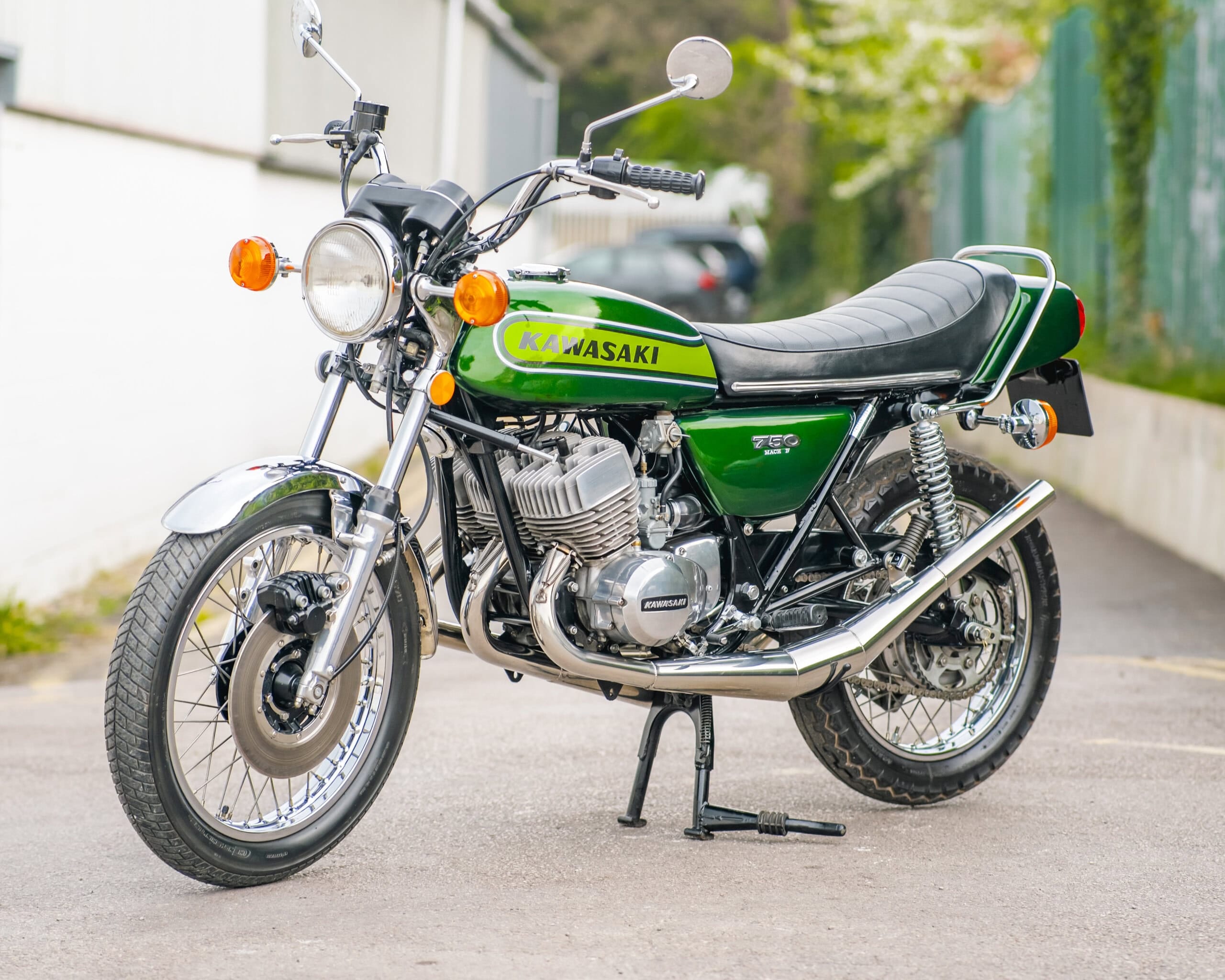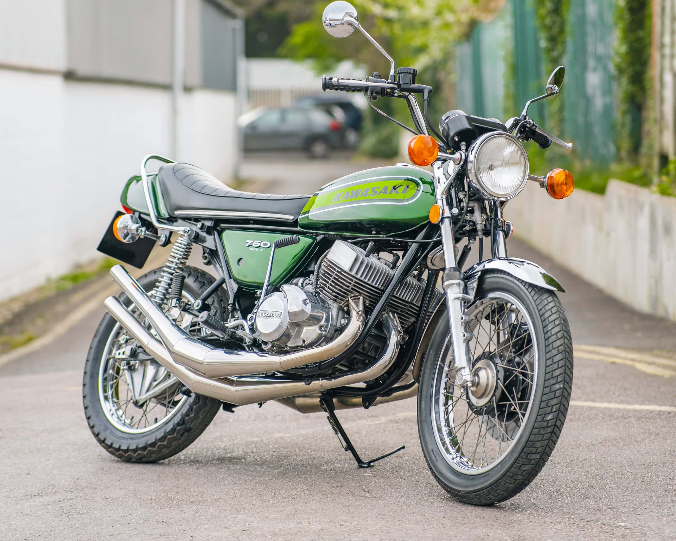 Engine: 748cc, air-cooled, inline three-cylinder, 2-stroke engine – known for its explosive power and raw riding experience.