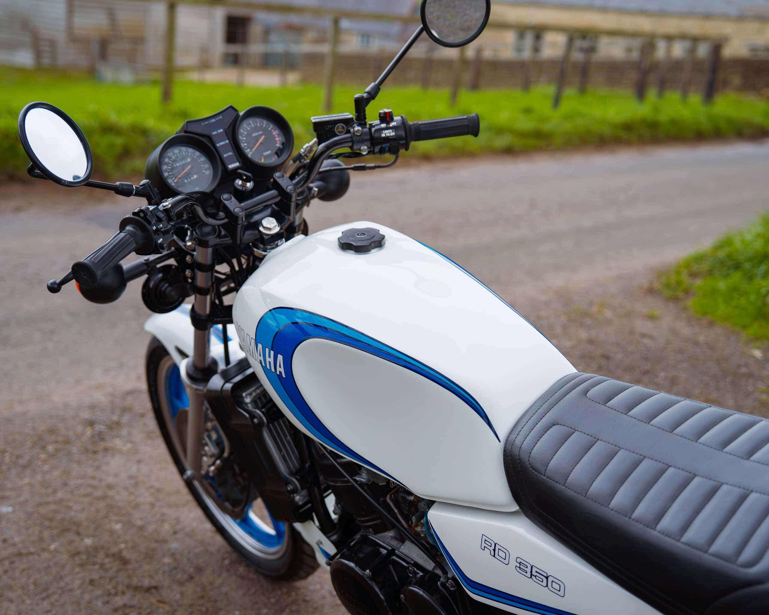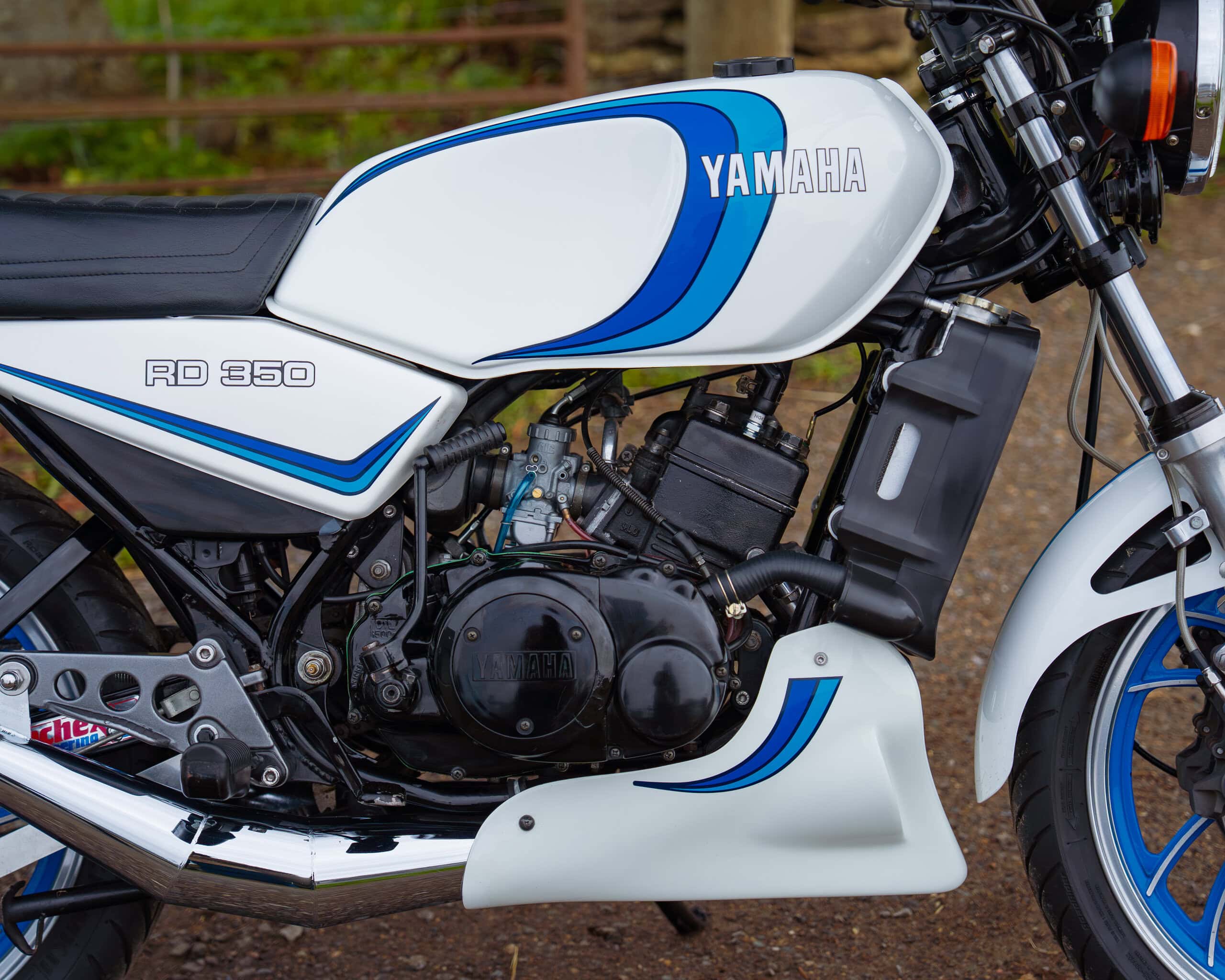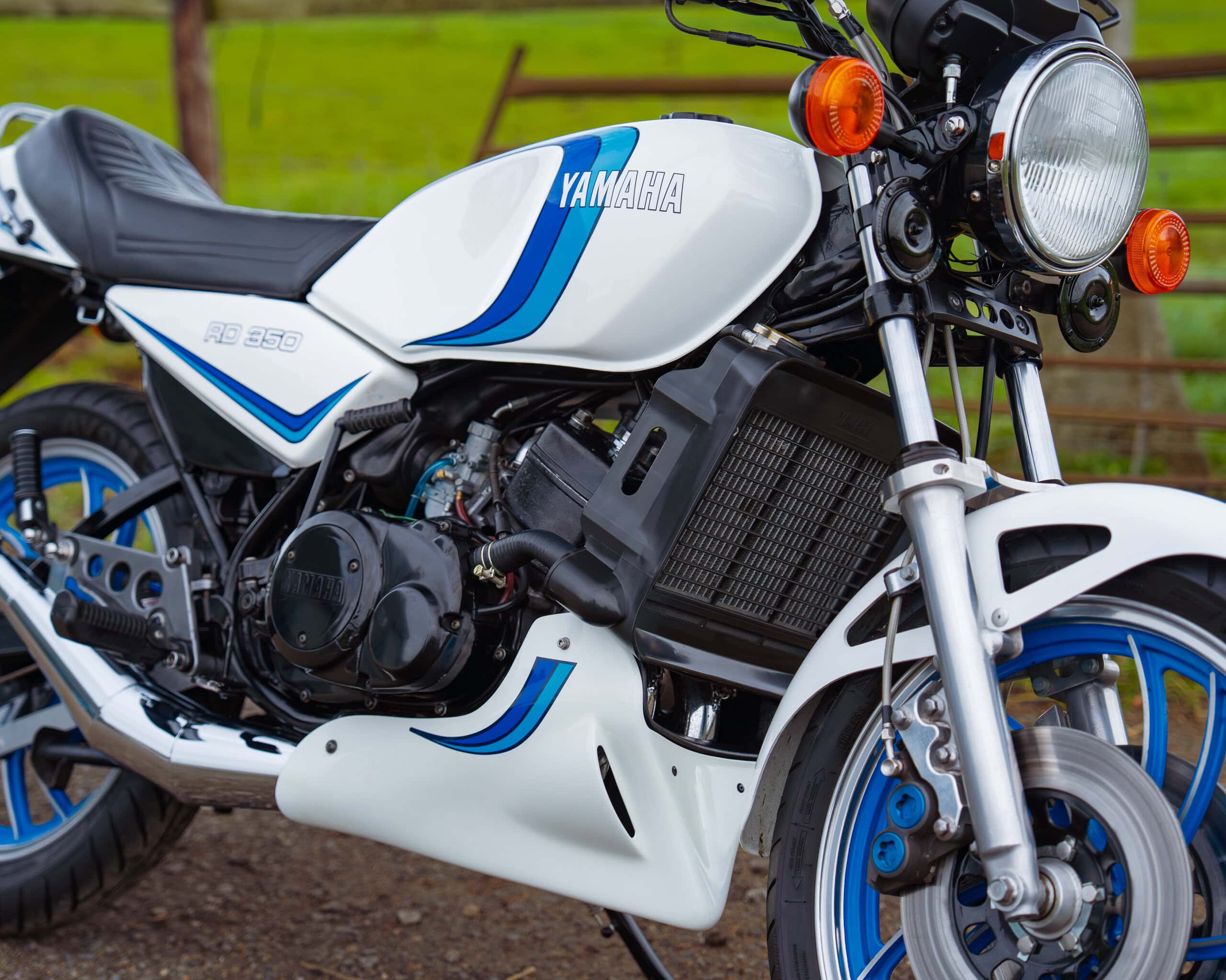 A lovely example of the iconic 1981 Yamaha RD350LC, fully rebuilt in 2013 with key electrical components renewed, including a new wiring loom, ignition coil, and CDI unit. This LC presents beautifully in the sought-after Bounty white-and-blue colour scheme, complemented by striking blue-painted wheels for a proper period look.