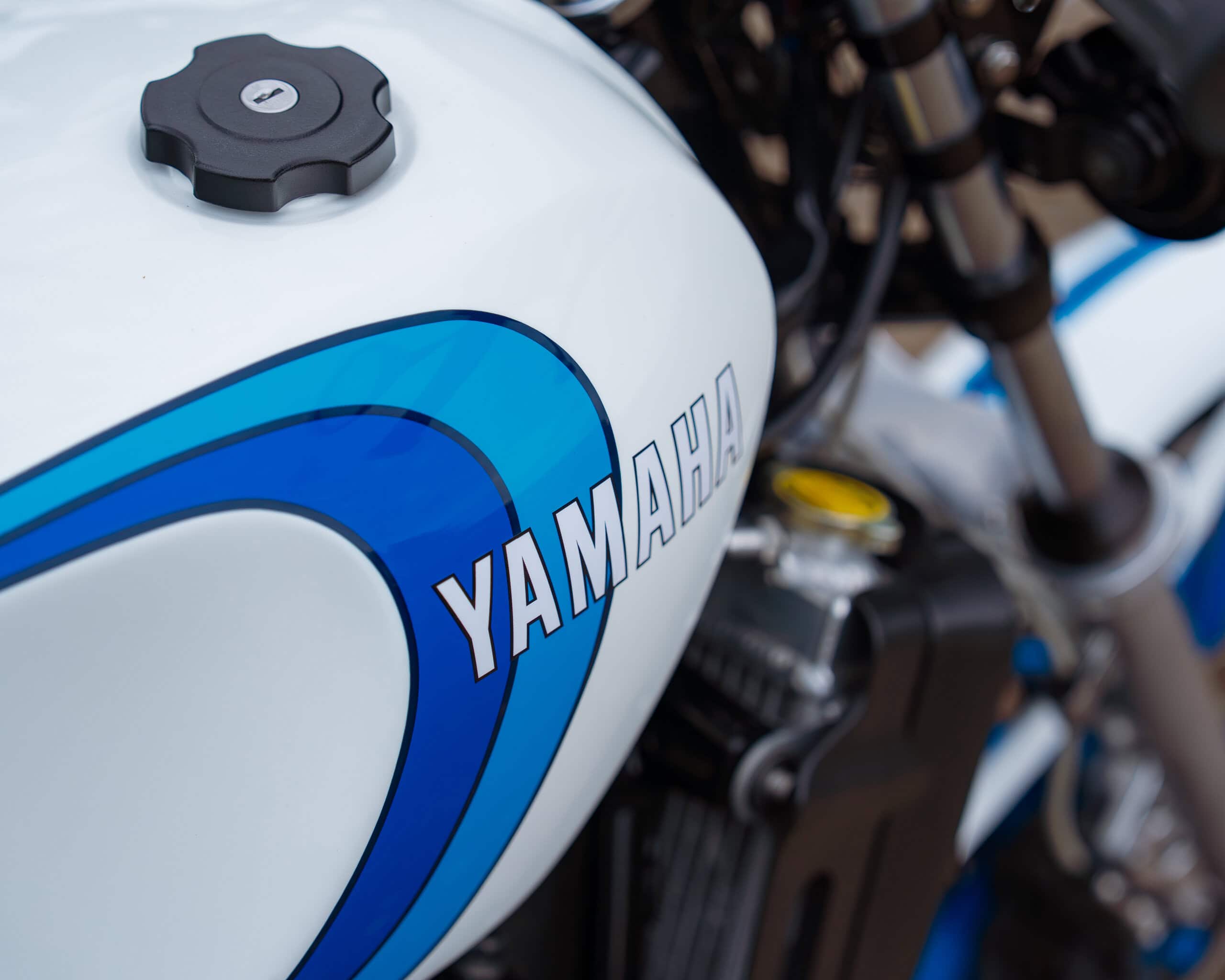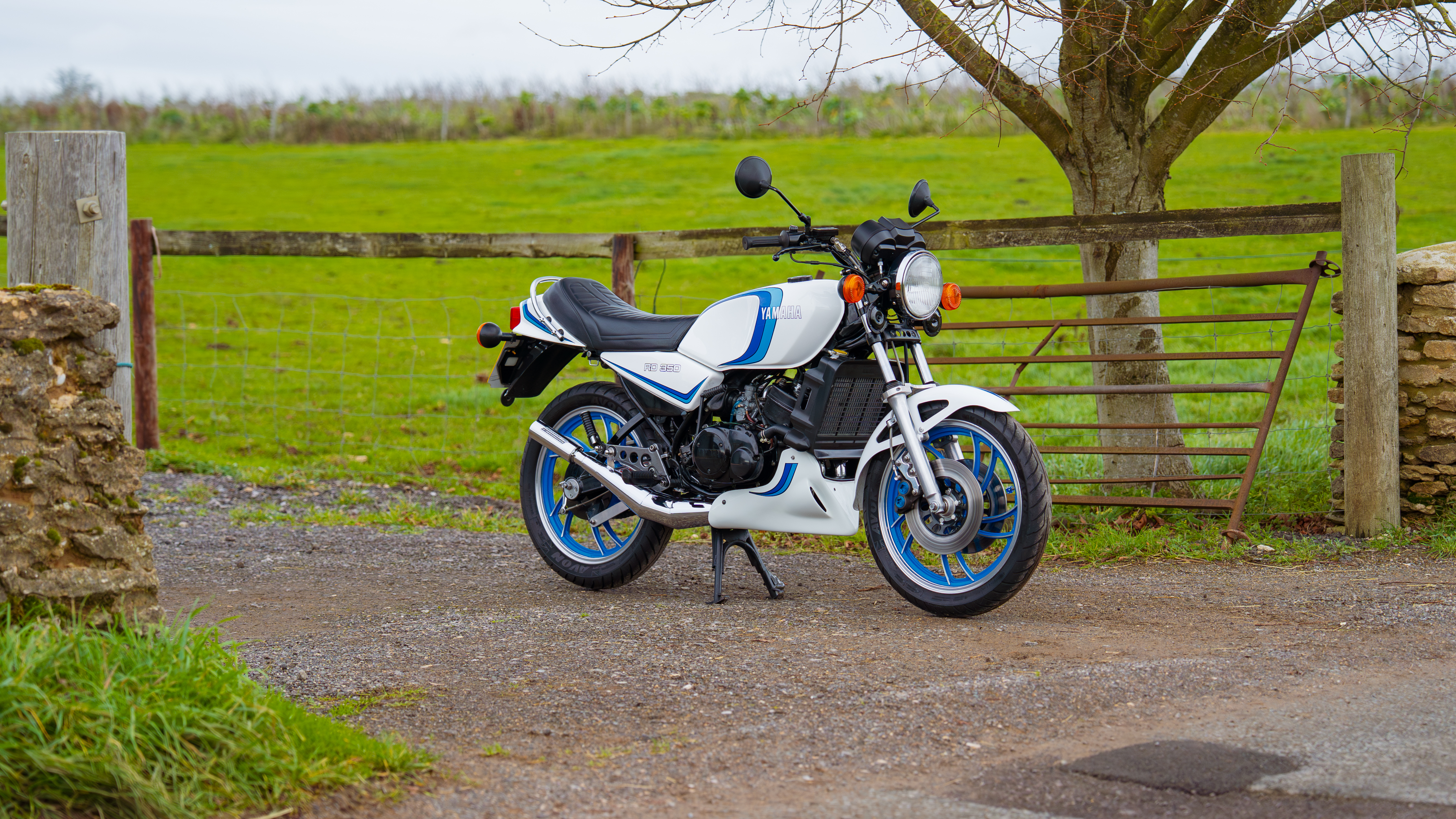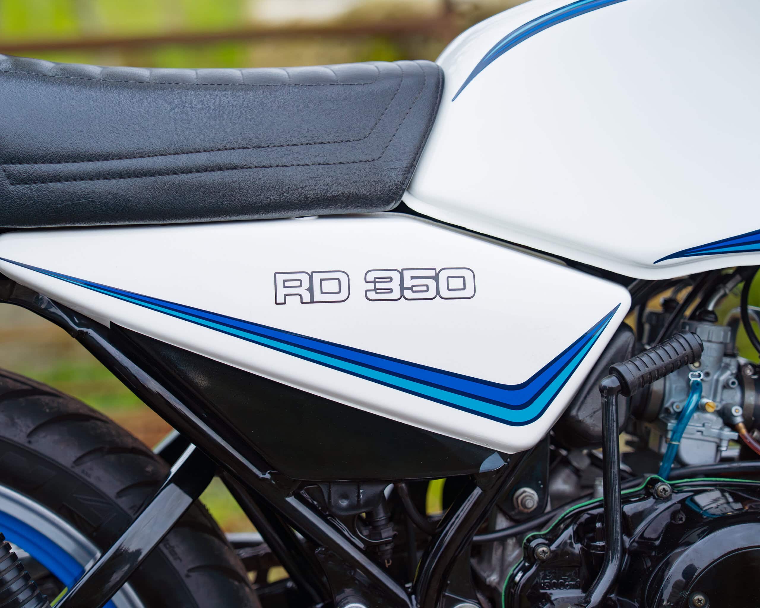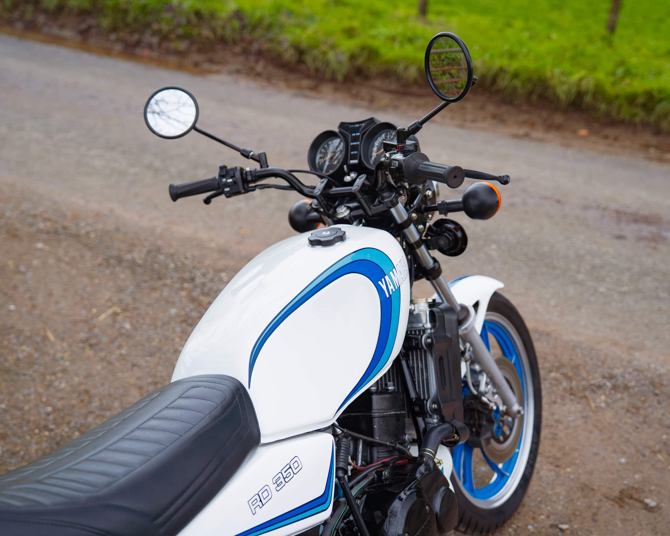 A lovely example of the iconic 1981 Yamaha RD350LC, fully rebuilt in 2013 with key electrical components renewed, including a new wiring loom, ignition coil, and CDI unit. This LC presents beautifully in the sought-after Bounty white-and-blue colour scheme, complemented by striking blue-painted wheels for a proper period look.