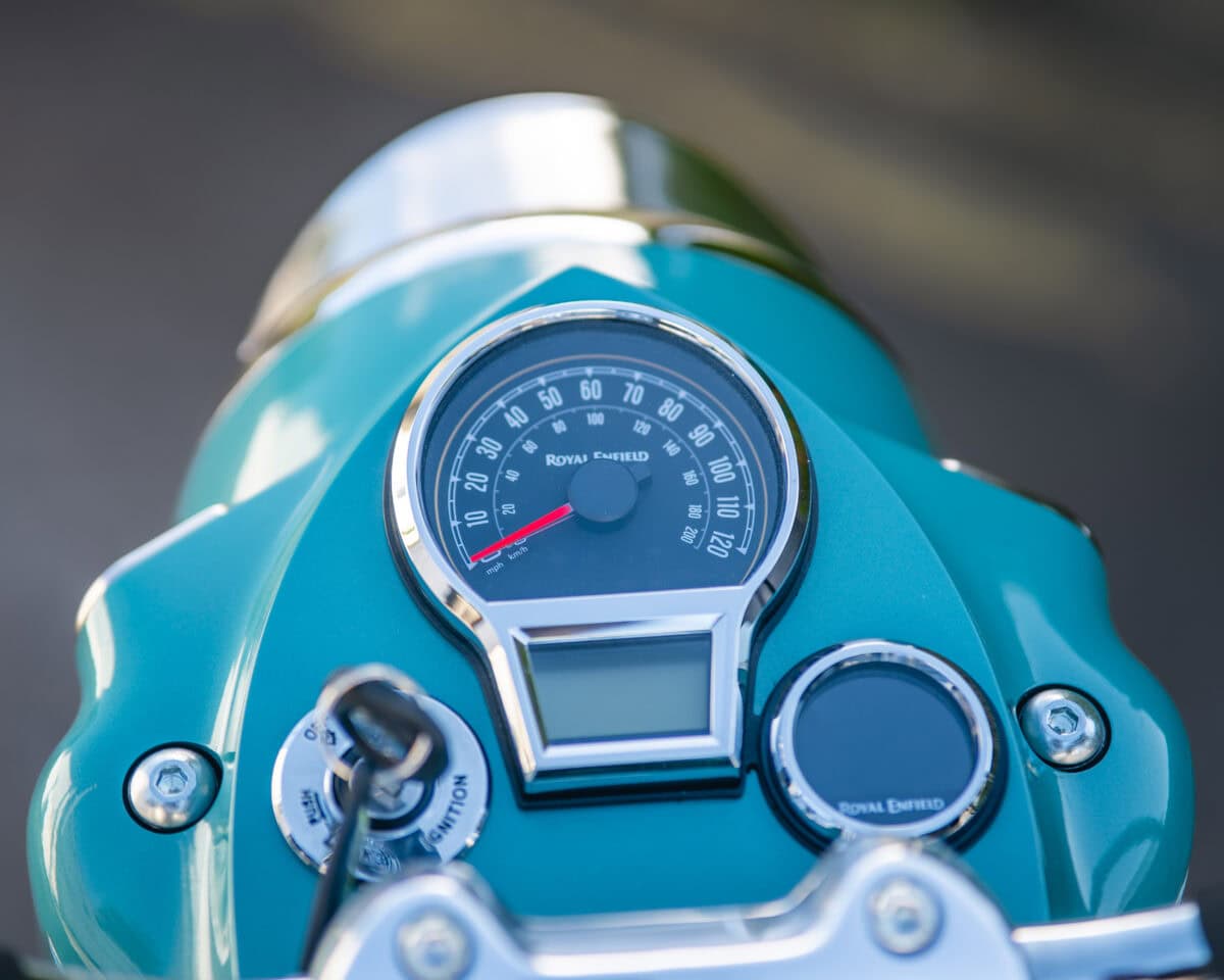 Classic teardrop fuel tank, chrome detailing, and nostalgic Royal Enfield styling cues.
