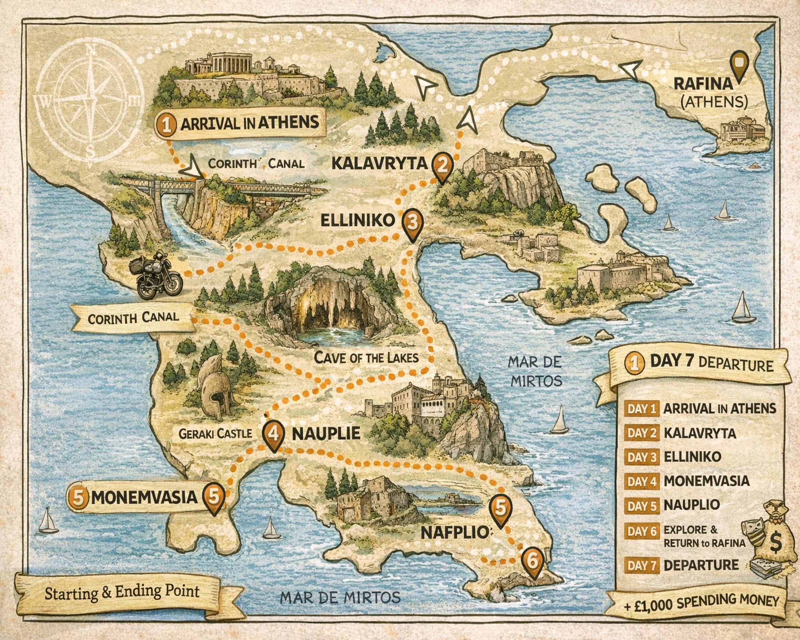 As you journey from the iconic Corinth Canal to the mountain roads of Kalavryta, the historic sites of Sparta and Epidaurus, and the breathtaking fortress of Monemvasia, you’ll experience a perfect blend of culture, scenery, and adventure. With all accommodation, meals, transfers, and entry to key landmarks included, plus luggage support throughout, this tour combines the thrill of riding Greece’s most scenic routes with the comfort and security of a fully supported, expertly guided experience.